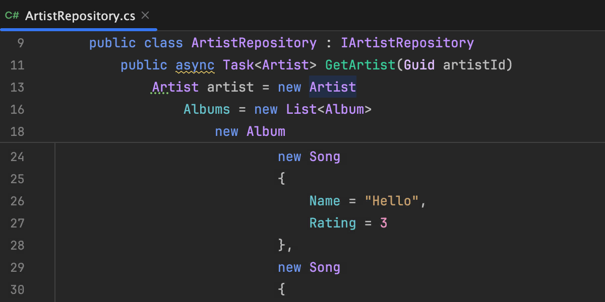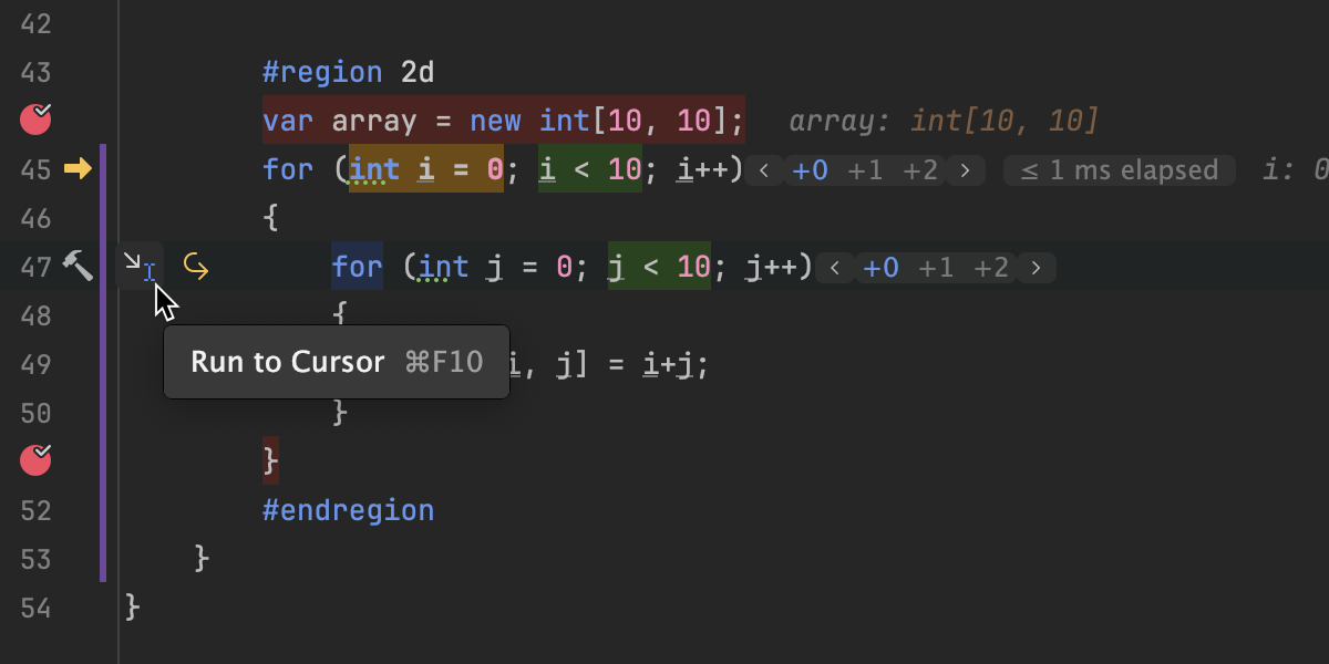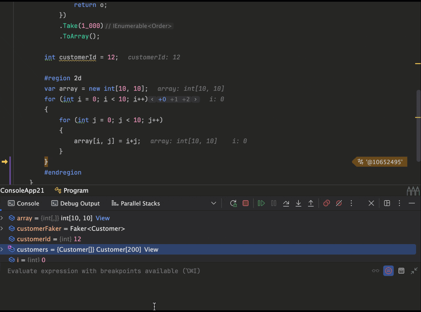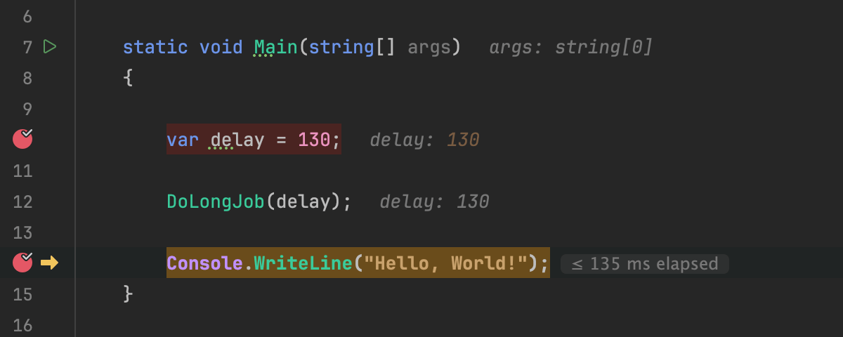 调试时,能够评估调试器在两个断点之间执行代码所需的时间非常有价值。 如果您发现步进时间过长,则可能表明代码存在性能问题。 使用 Rider 调试应用程序时,您将看到一个内联提示,显示上一个断点与当前断点之间经过的时间。