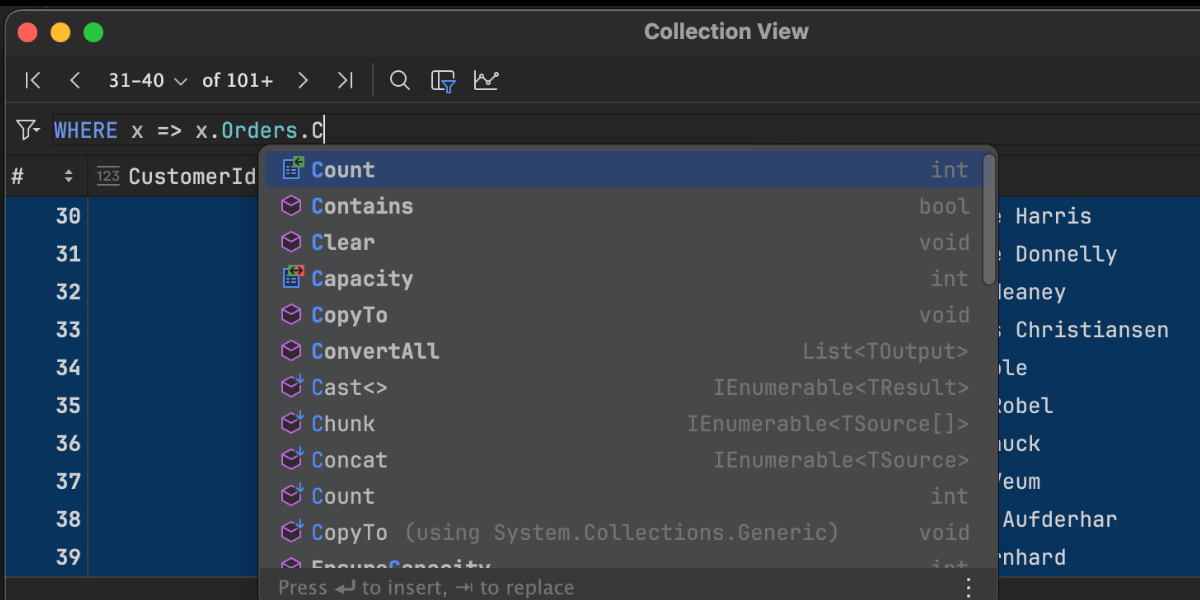 Rider 2024.1 中的集合可视化器提供集合(数组、列表、字典和其他可枚举类型)的图形表示,可用于展开和收起元素、查看各个值,以及轻松浏览数据结构。 这有助于在调试期间了解程序数据的状态以及诊断与收集、操作或数据处理相关的问题。
