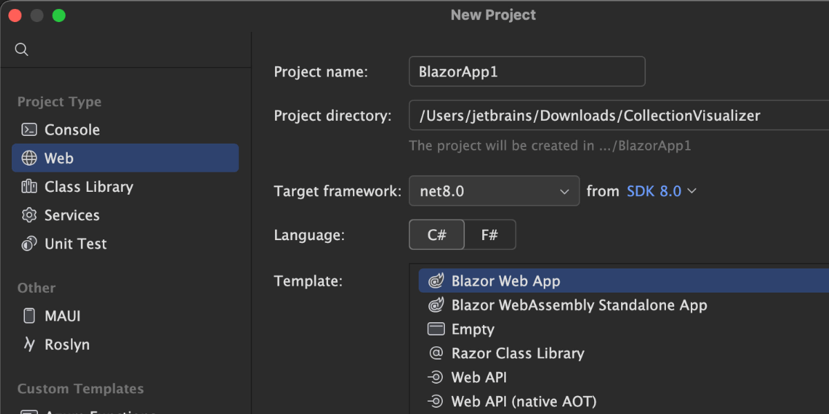 我们彻底重做了 New Project(新建项目)对话框,使新项目易于配置。 它提供了对 .NET 特定的项目配置和自定义模板参数的全面支持,您现在可以直接从对话框安装目标 SDK 和适当的 MAUI 工作负载。