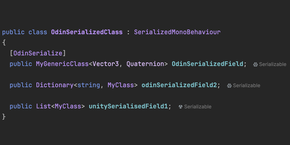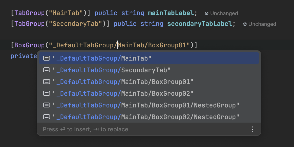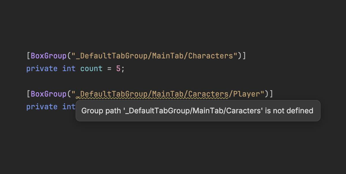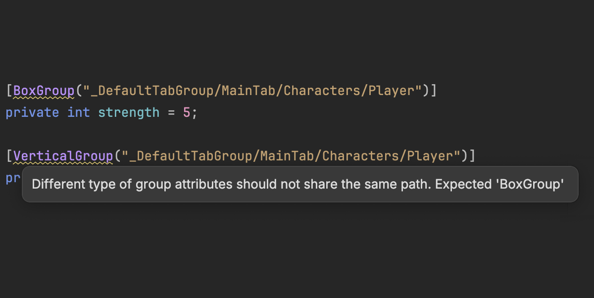 我们非常高兴地宣布,我们已与 Sirenix 的同仁达成合作,为热门 Odin Inspector Unity 资源提供支持。 Rider 将识别并高亮显示 Odin Inspector 序列化的字段和属性,为布局特性中的组名称提供补全和检查,并显示 Odin 的 GUIColor 类的预览。 它还会识别 Odin 的 range 特性,并在 Rider 自己的整数值分析中使用这些值,如果值超出范围,则会发出警告。