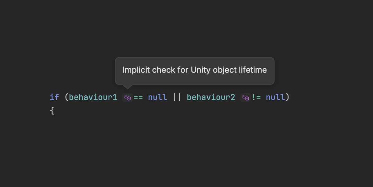 此版本更新了检查底层游戏对象生命周期时 Rider 如何高亮显示 Unity 对 null 相等比较的可能意外处理。 如果现代 C# null 检查绕过生命周期检查,Rider 现在会高亮显示 null 比较何时执行检查,而不是显示警告。