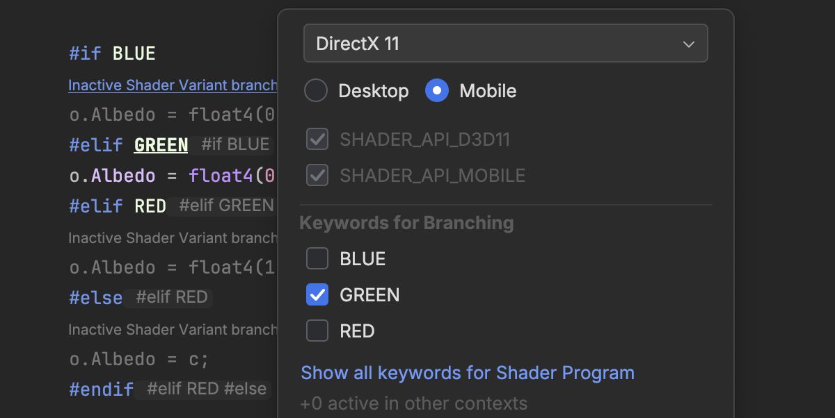 Rider 2024.1 基于 2023.3 版本中引入的着色器关键字支持构建。 您可以在编辑着色器文件时启用或禁用不同的关键字,从而启用和禁用不同预处理程序分支中的高亮显示和代码分析。 此版本增加了对隐式着色器关键字、阶段特定的局部关键字以及带有 _KEYWORD_DEFINED 后缀的预处理程序指令的支持。