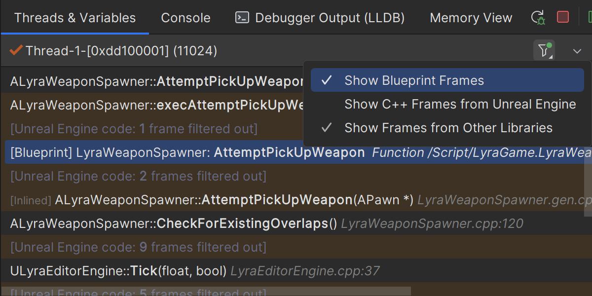 我们很高兴向调试器调用堆栈添加蓝图支持。 Rider 现在不会在调用堆栈中显示匿名内存地址,而是显示蓝图调用相关信息,并与现有 C++ 代码交错。 请确保更新到最新版本的 RiderLink 插件!