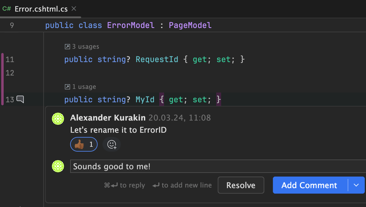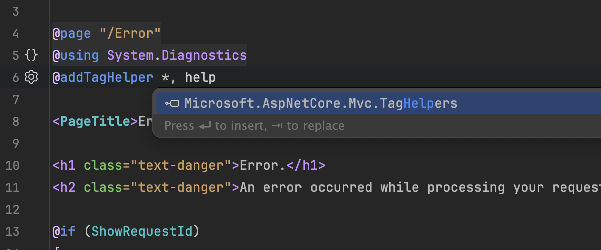 @addTagHelper 和 @removeTagHelper 指令解析引用 Rider 现在可以为 Razor 视图中 @addTagHelper 和 @removeTagHelper 指令内指定的程序集名称解析引用。 因此,您现在可以受益于代码补全、查找用法以及便利的代码导航。