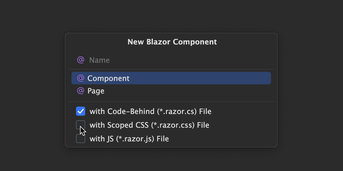 现在,您可以在生成 Blazor Component(Blazor 组件)文件模板时生成额外文件,例如 .razor.cs、.razor.css、.razor.js。