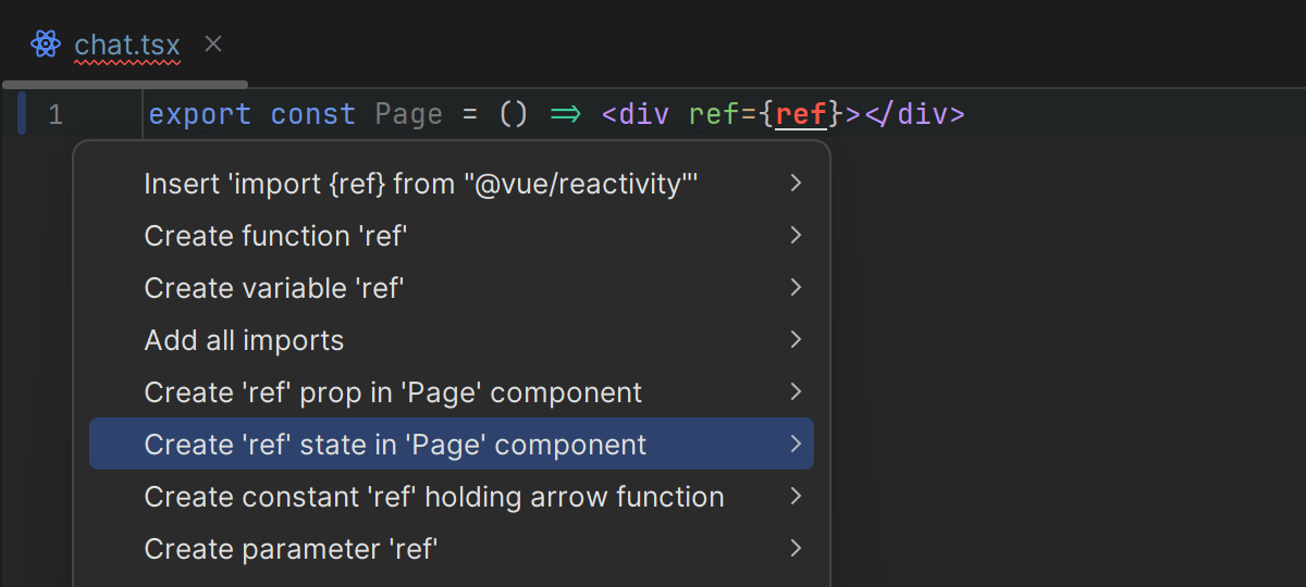 Rider 2024.1 为 React 新引入了多个快速修复,可供动态创建 props 和状态。 您可以使用快捷键 Alt+Enter 应用这些快速修复。