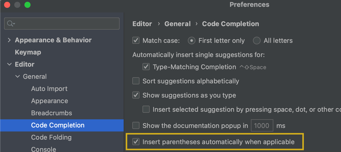 现在,您可以选择是否希望 RubyMine 在代码补全时自动插入圆括号。 要启用圆括号自动插入,请转到 Settings/Preferences | Editor | General | Code Completion(设置/偏好设置 | 编辑器 | 常规 | 代码补全),选中 Insert parentheses automatically when applicable(适用时自动插入圆括号)复选框。
