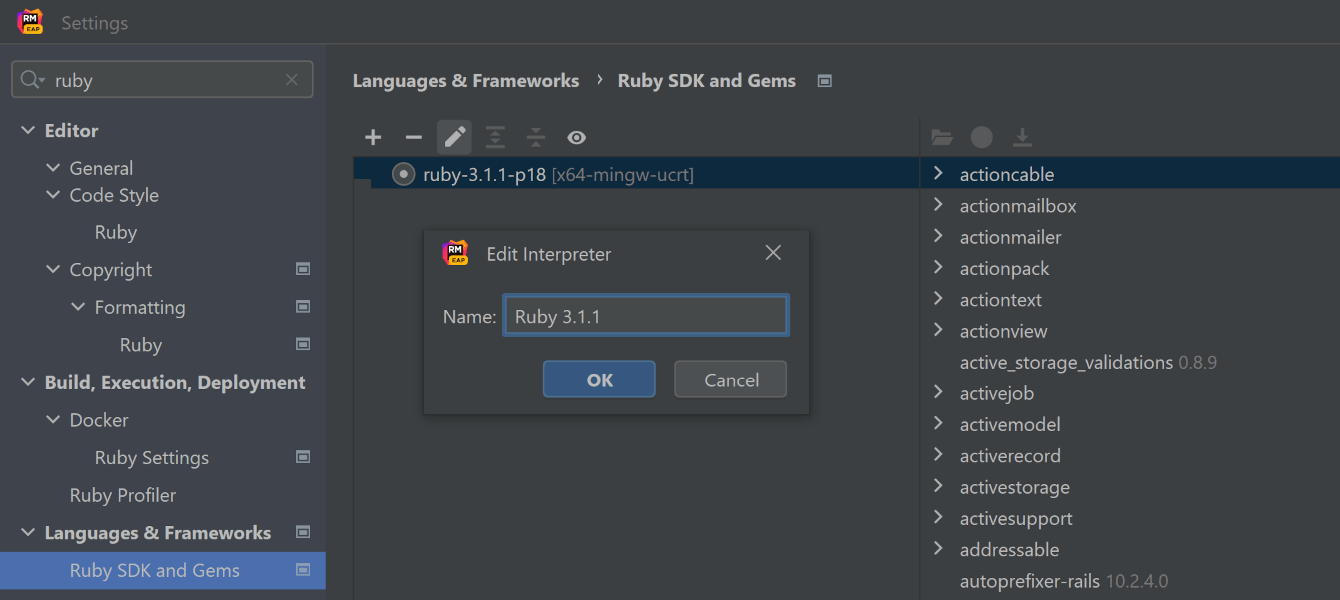 如果您为不同的项目使用不同的 Ruby,现在可以在 Ruby SDK 设置中编辑解释器名称。 此功能有助于使各种 SDK 更易读,并避免在选择时产生混淆。