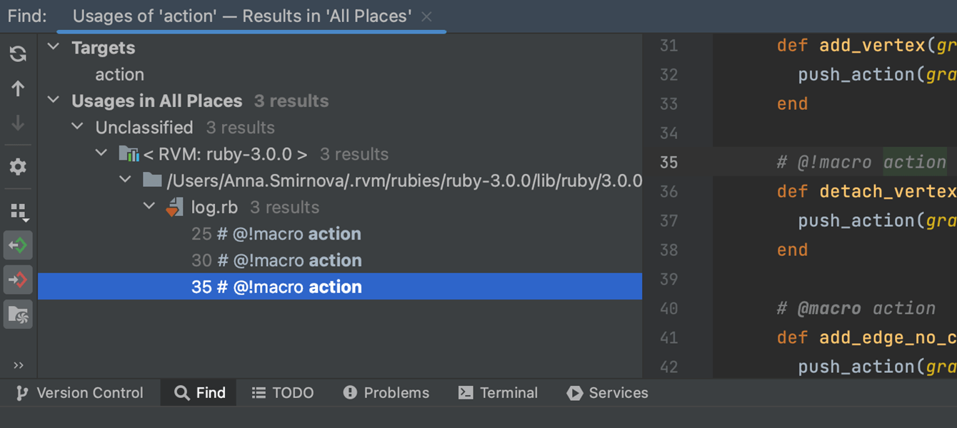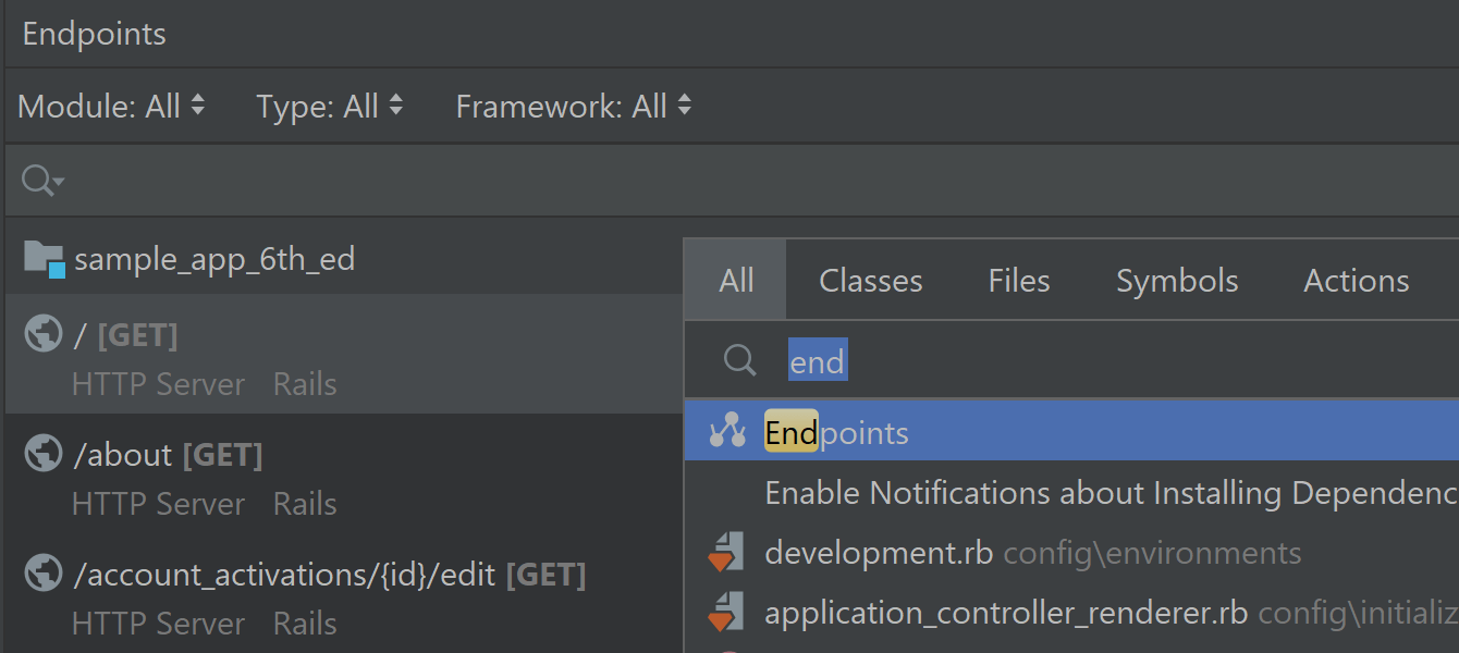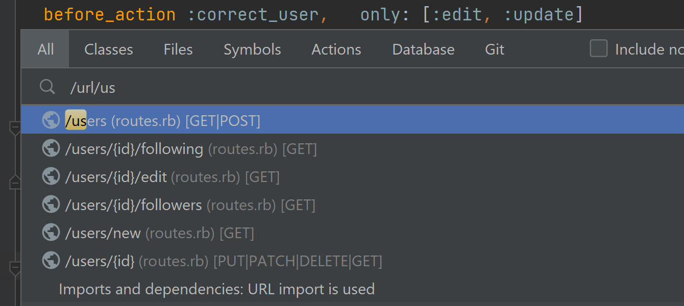 RubyMine 现在支持搜索 Rails URL。 只需在 Search Everywhere(随处搜索)对话框中输入 /url 即可查找和导航到包含所需 URL 的文件。 您还可以使用键盘快捷键:Ctrl+Shift+\。