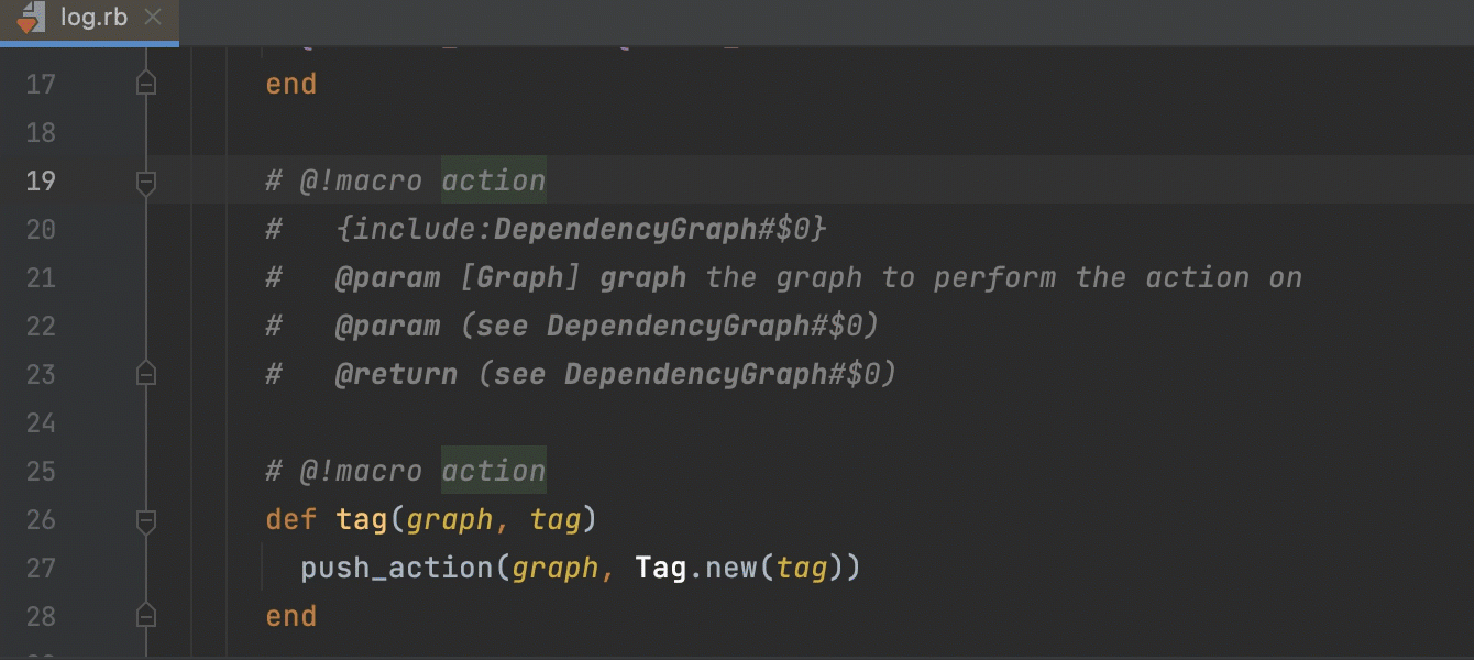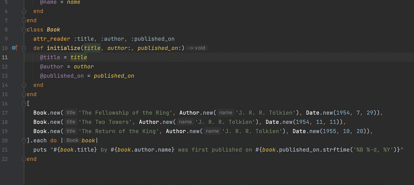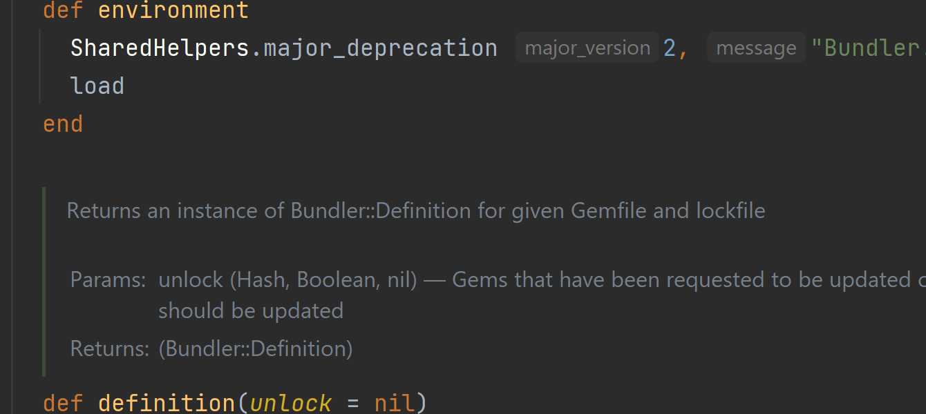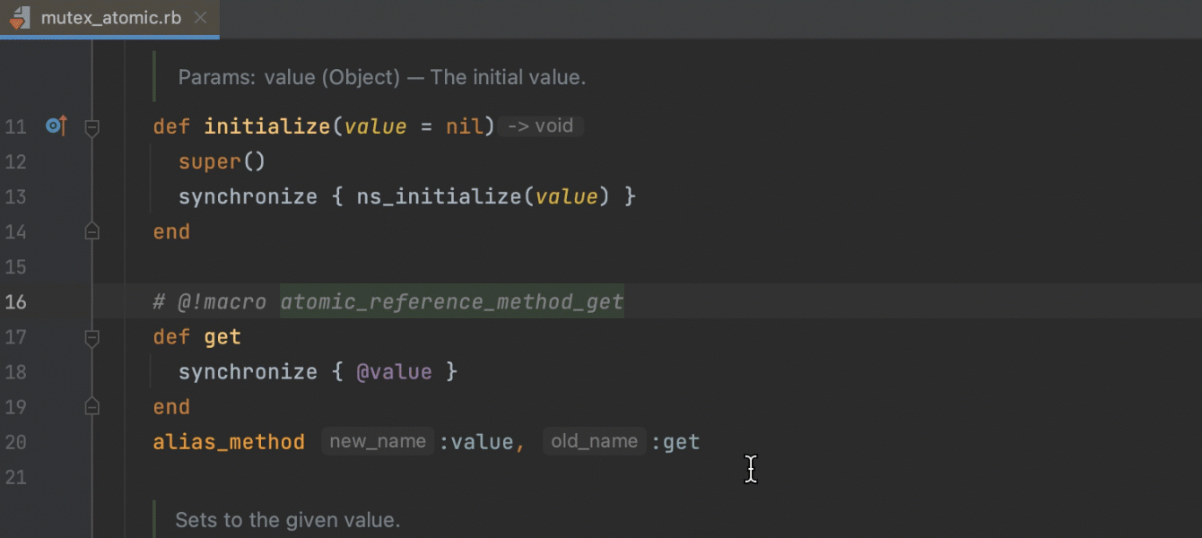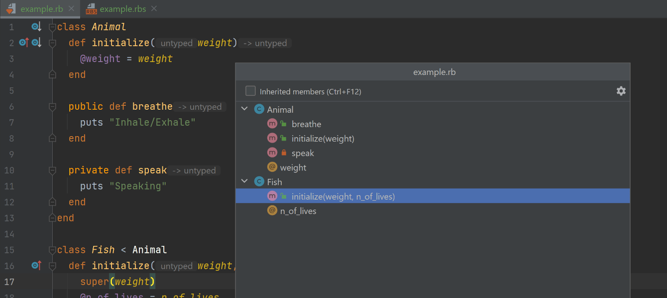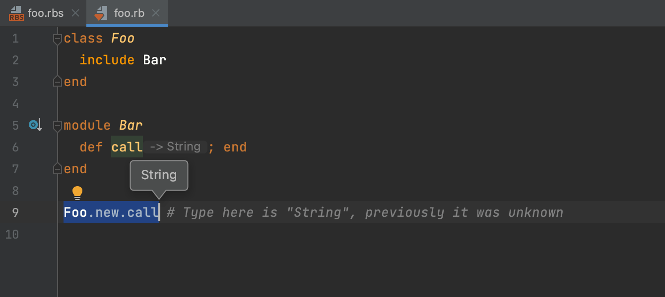 未知类的类型推断已得到改进,RubyMine 现在将查找来自 Ruby 的所有已知上级的方法的类型,而不仅仅是 Object。