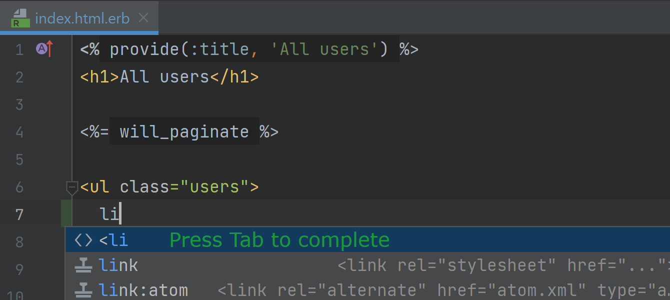 编辑 .html.erb 文件时,您不再需要手动输入打开的 HTML 标记。 只需输入 HTML 标记的名称,RubyMine 就会提供合适的自动补全建议。 按 Tab 自动补全标记,然后继续编辑标记内的内容。