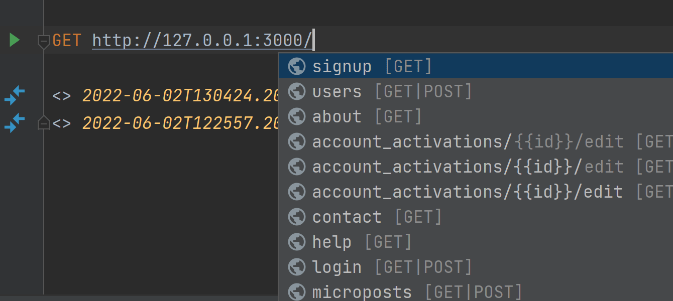 我们为 HTTP 请求引入了自动补全。 这意味着,您可以自动补全 Rails URL 并导航到相关 Routes。 补全建议还会显示可用 HTTP 请求的类型。