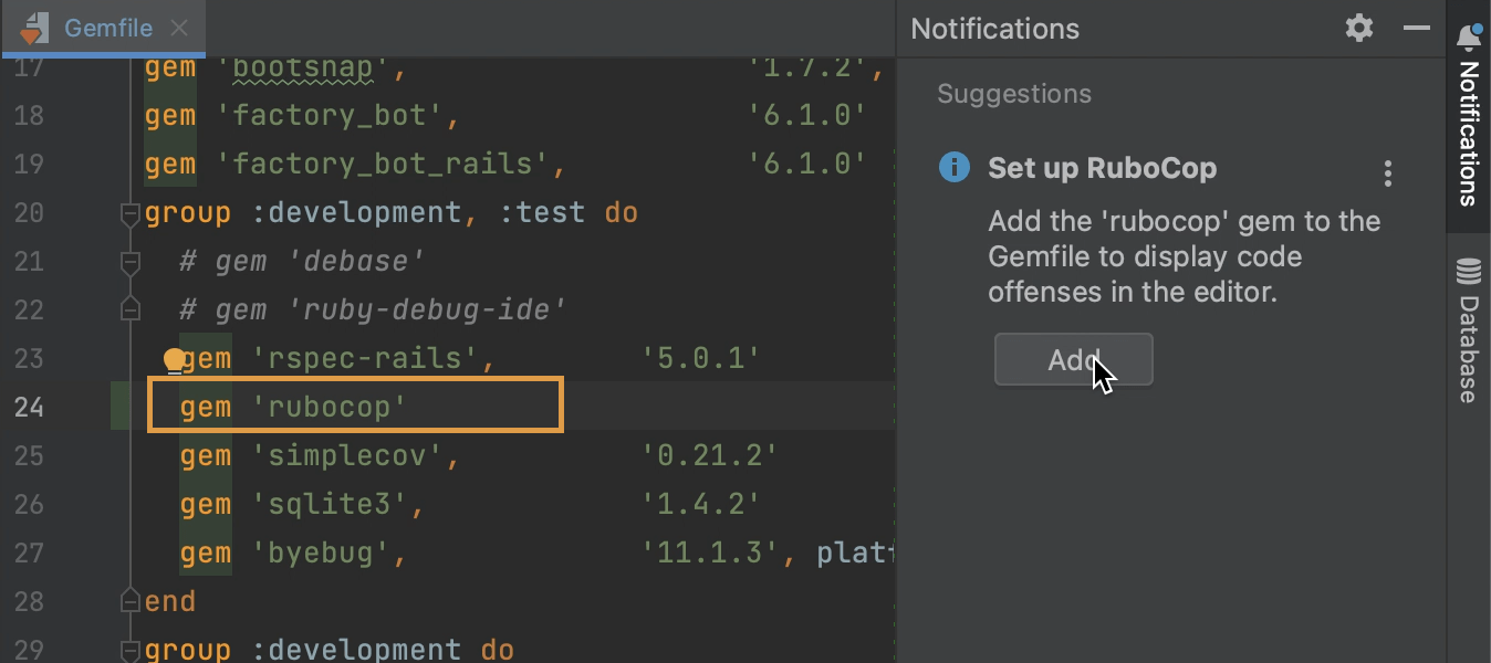 现在你可以打开 Gemfile,并从 通知工具窗口 中直接添加 RuboCop gem。 在 Notifications(通知)工具窗口中看到 Set up RuboCop(设置 RuboCop)建议时,点击 Add(添加)。