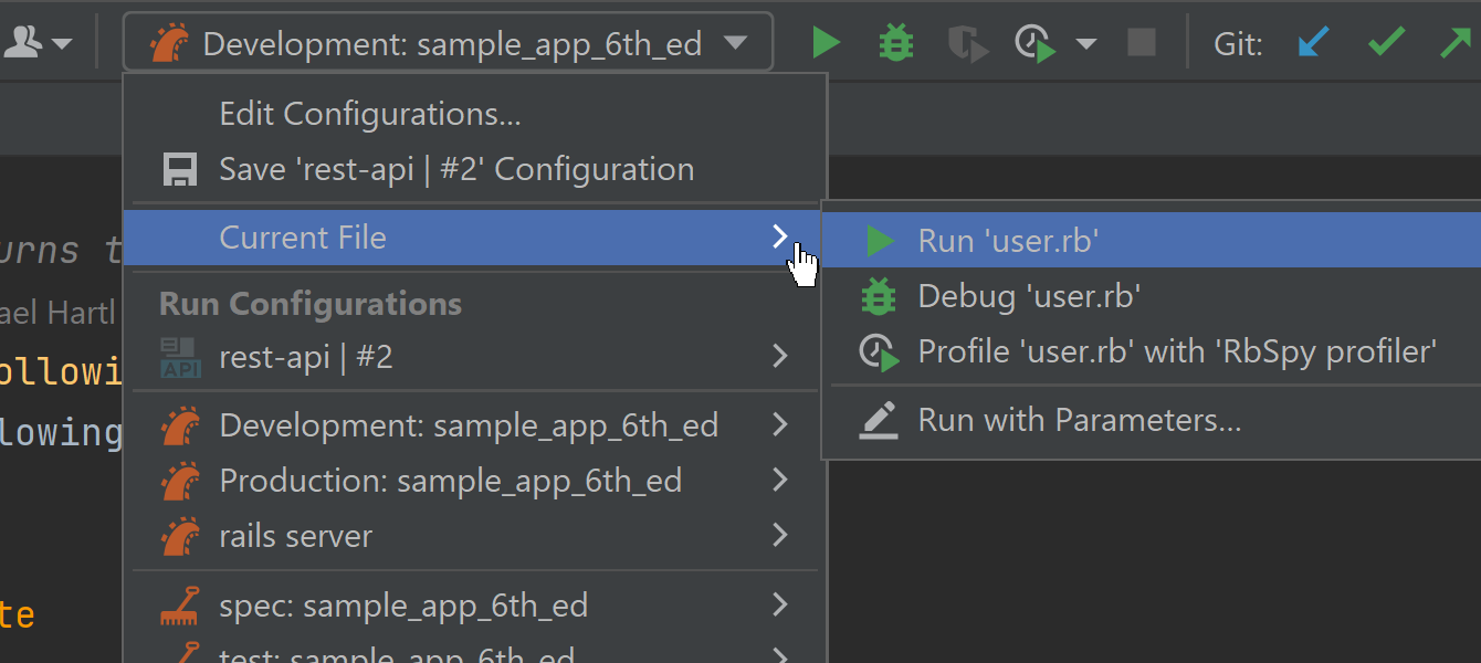 RubyMine 使用 运行/调试配置 来运行、调试、部署和测试你的代码。 在此版本中,我们引入了一项新功能,用于运行和调试编辑器中当前打开的文件。