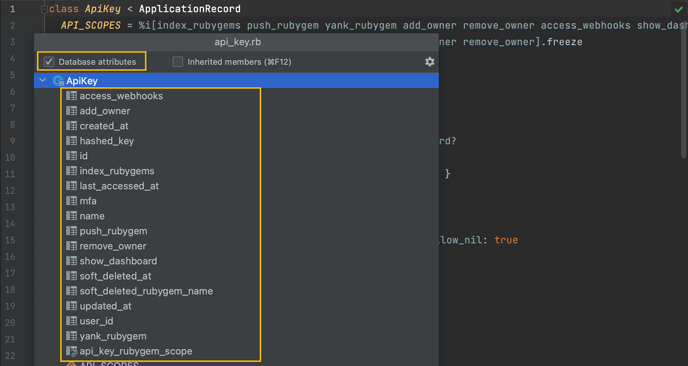 RubyMine 现在会在 Structure(结构)视图树最顶部显示数据库特性,并且将其默认启用。 此功能在 Structure(结构)工具窗口 (Alt+7) 和 Structure(结构)弹出窗口 (Ctrl+F12) 中均可用。