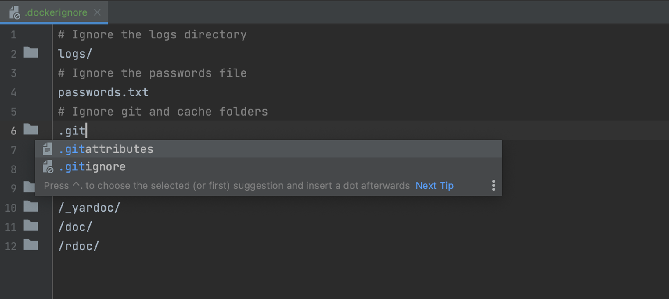 我们引入了对 .dockerignore 文件的全面支持,包括代码高亮显示和补全。 从 IDE 构建镜像时,这些文件会被纳入考量。