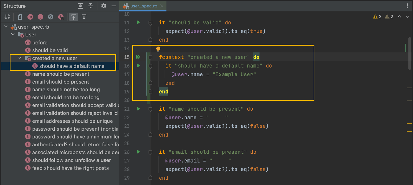 xdescribe、xcontext、fdescribe、fcontext RubyMine 可以识别 xdescribe、xcontext、fdescribe 和 fcontext 示例组别名并在 Structure(结构)工具窗口中显示这些块。 您还可以使用编辑器中的装订区域图标运行这些测试。