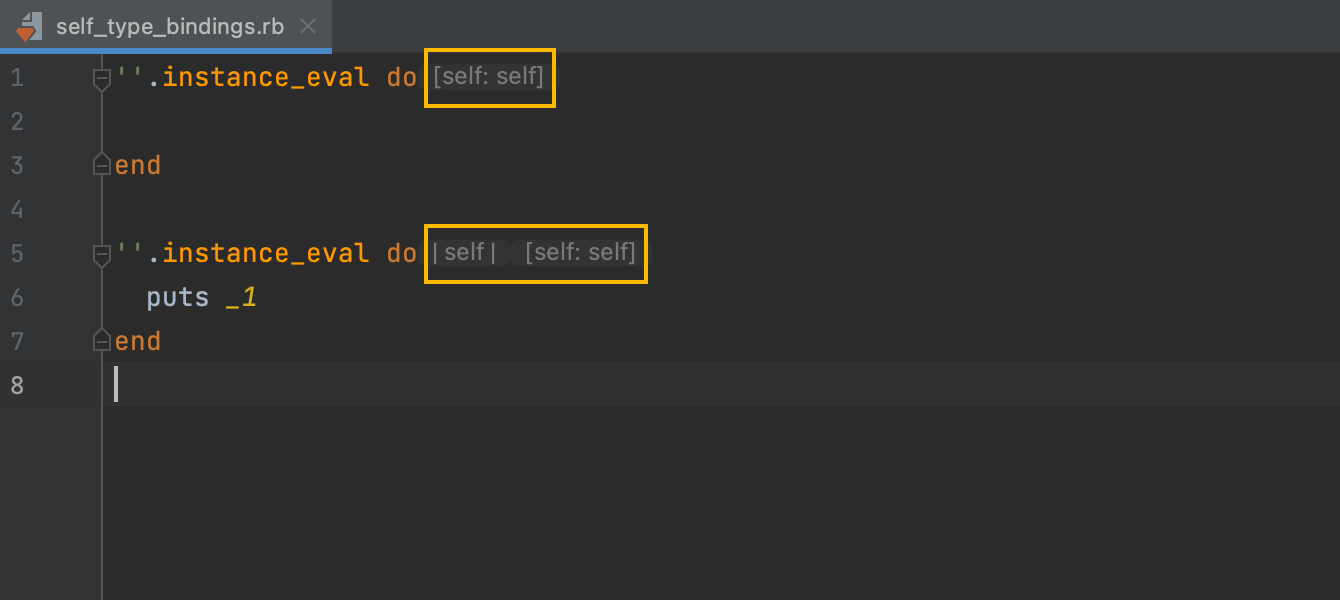 RBS 中具有 self 类型绑定的块现在获得了新的嵌入提示。 RubyMine 现在也仅在块内使用编号形参时才显示编号形参类型提示,避免显示过多的嵌入提示。