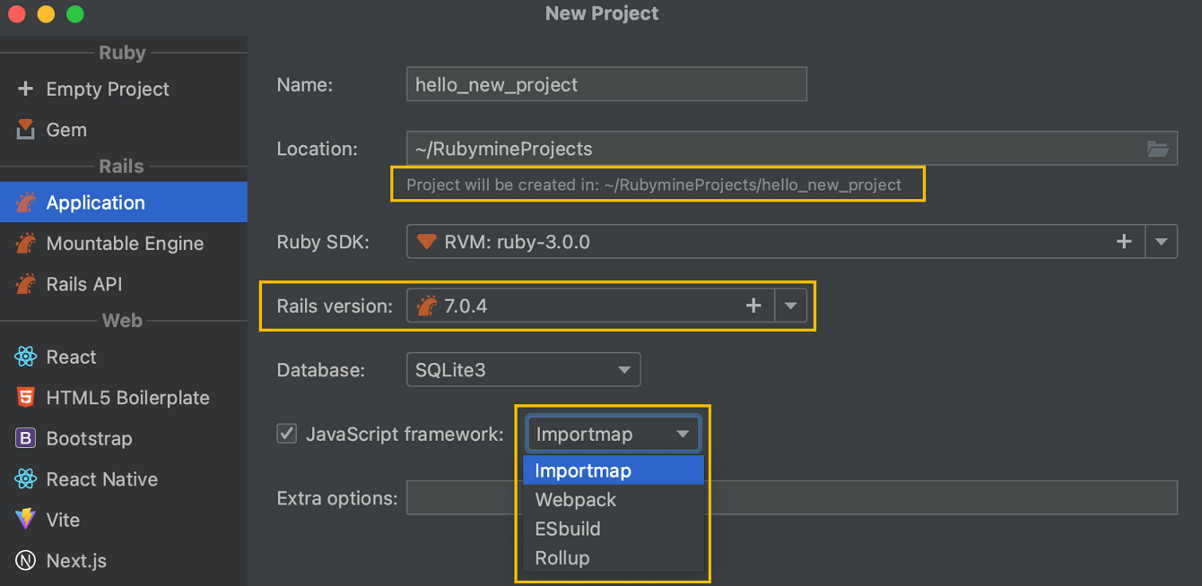 创建新 Rails 项目时,您会在 Location(位置)字段下方看到其路径。 我们更新了 Rails 版本字段,因此使用加号图标可以更轻松地安装必要版本的 Rails gem。 在 JavaScript framework(JavaScript 框架)字段中,我们将“default”值替换为默认使用的框架的显式名称。