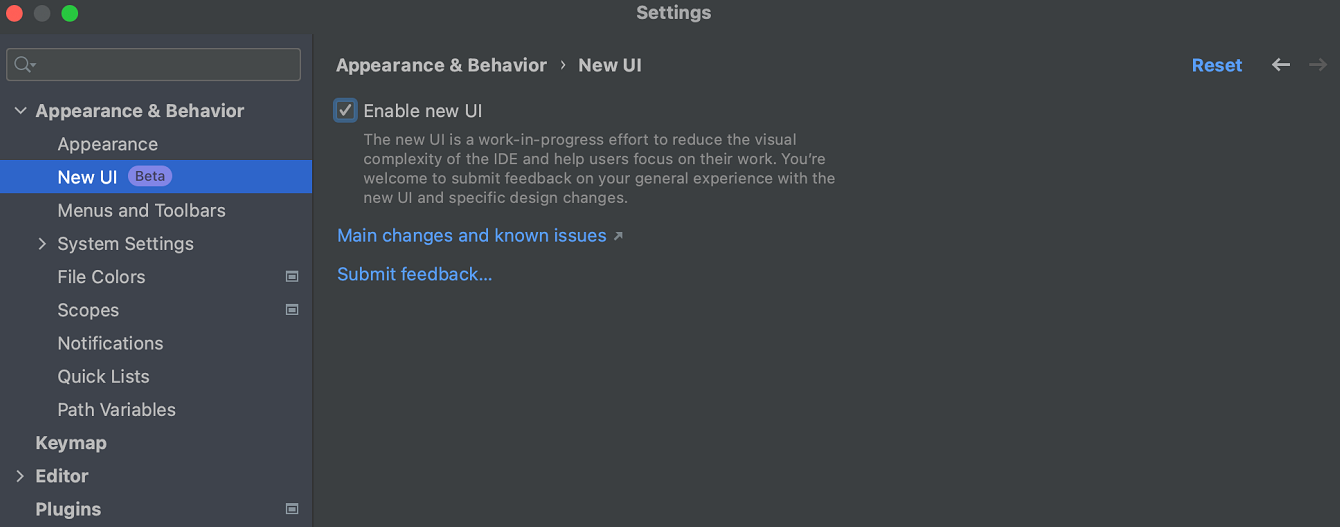 我们邀请您试用新的 RubyMine UI。 它让您可以轻松访问核心功能,并可根据需要逐级呈现复杂功能,从而打造更现代、更强大、更简洁的外观和质感。 您可以在 Settings | Appearance & Behavior | New UI (Beta)(设置 | 外观与行为 | 新 UI(测试版))中切换到新 UI。