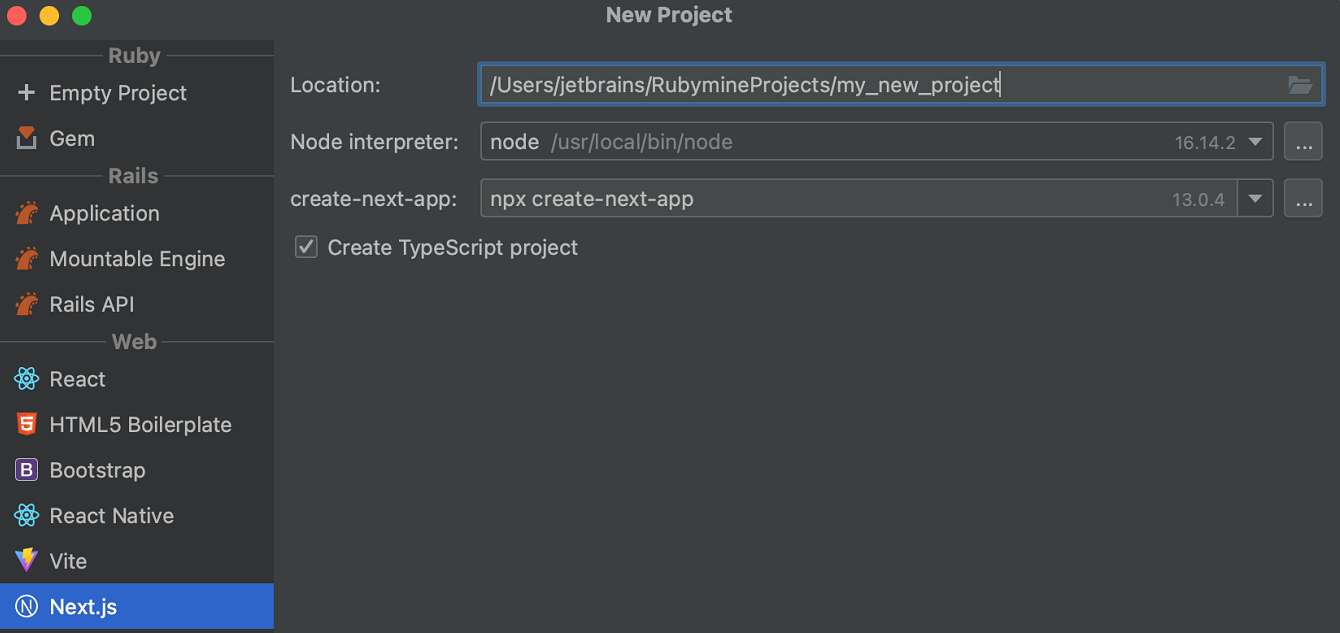 RubyMine 欢迎屏幕上的 New Project(新建项目)向导中现在包含适用于 Vite 和 Next.js 的项目模板。 我们还更新了适用于 Vue 的项目模板,以确保其符合最新标准。