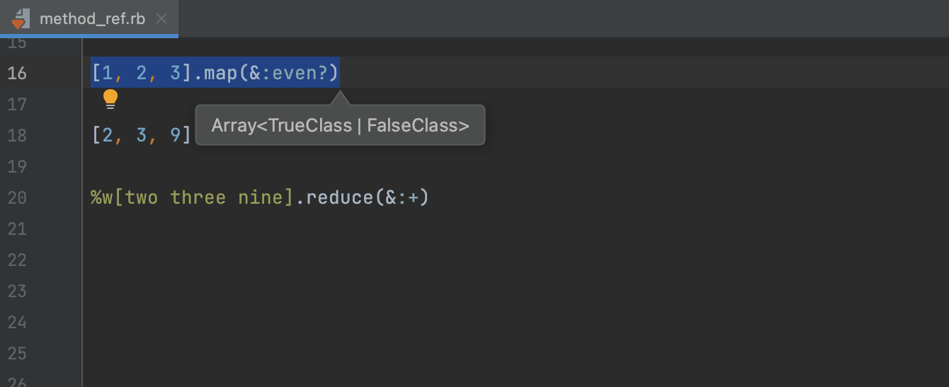 调用方法引用时,现在可以使用对 RBS 类型信息的支持。 要调用显示方法中形参名称的弹出窗口(如果弹出窗口已经关闭或者如果 IDE 未配置为自动显示它),您只需选择该方法并按 Ctrl+Shift+P(或点击 View | Type Info(查看 | 类型信息))。