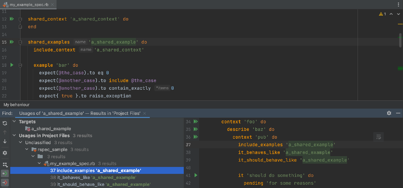 现在,您可以在 RubyMine 中搜索共享上下文的用法,并通过 Rename(重命名)重构更改共享上下文和示例的名称及其引用。