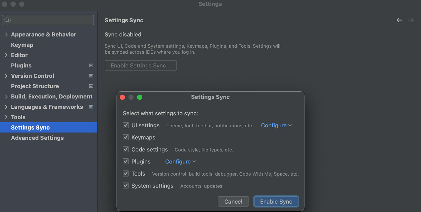 我们为自定义 IDE 设置同步引入了完全重做的解决方案。 新的 Settings Sync(设置同步)插件可以同步所有可共享的 IDE 设置、捆绑插件和第三方插件。 根据当前同步方式,您可能需要手动启用新插件。 要了解详情,请参阅这篇文章。