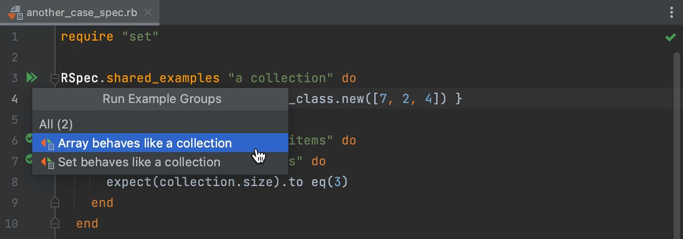 在这个版本中,我们添加了指定执行共享示例的上下文的选项。 现在,运行包含共享示例的规范时,RubyMine 会显示一个对话框,您可以在其中选择执行它们的上下文。