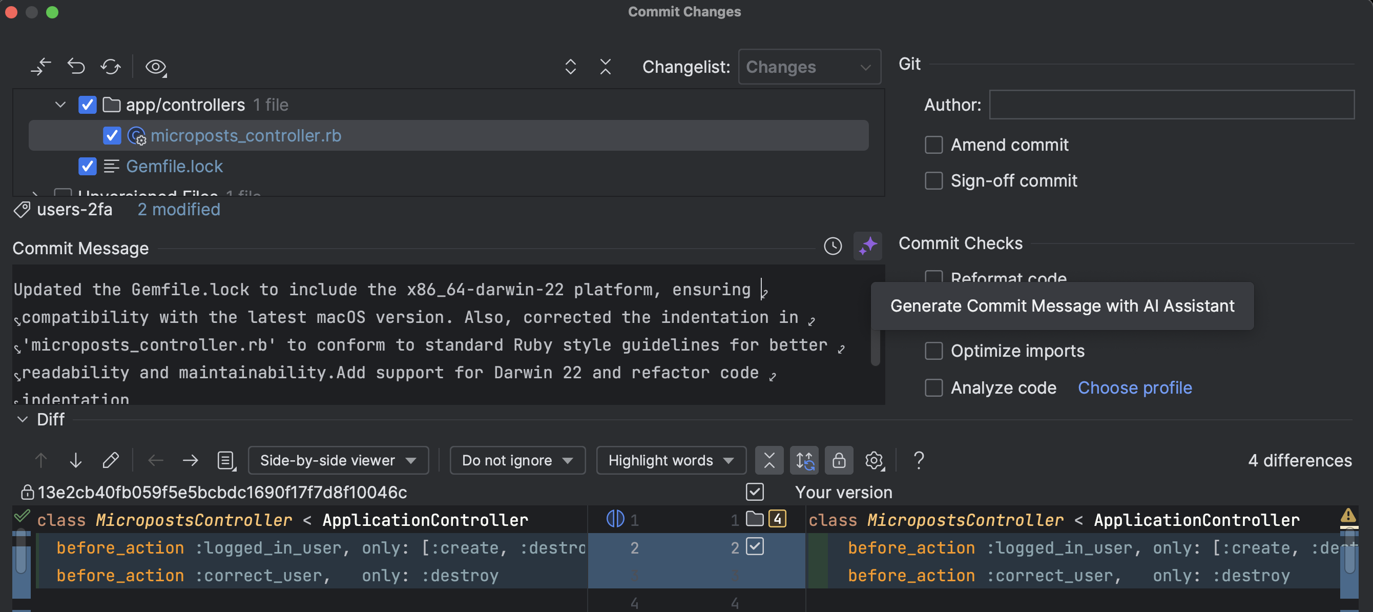 Commit Changes(提交更改)对话框现在有一个 Generate Commit Message with AI Assistant(使用 AI Assistant 生成提交消息)按钮。 点击该按钮可以将您的更改差异发送到 LLM,然后 LLM 将生成一条描述性提交消息,总结您的修改。