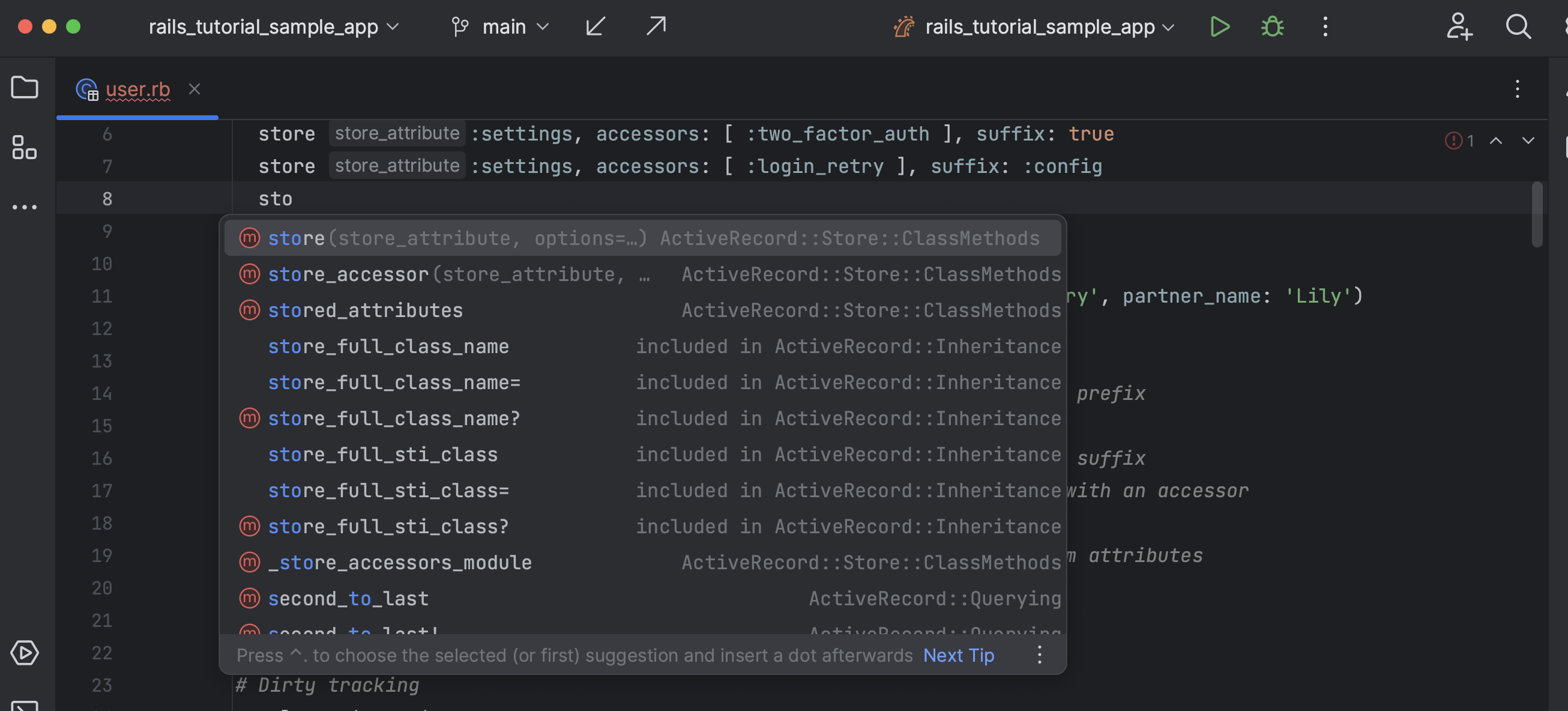 我们为 ActiveRecord::Store 访问器添加了代码洞察。 享受访问器的代码补全和导航、dirty 跟踪方法、访问上次保存期间所做更改的方法,以及对访问器的验证。