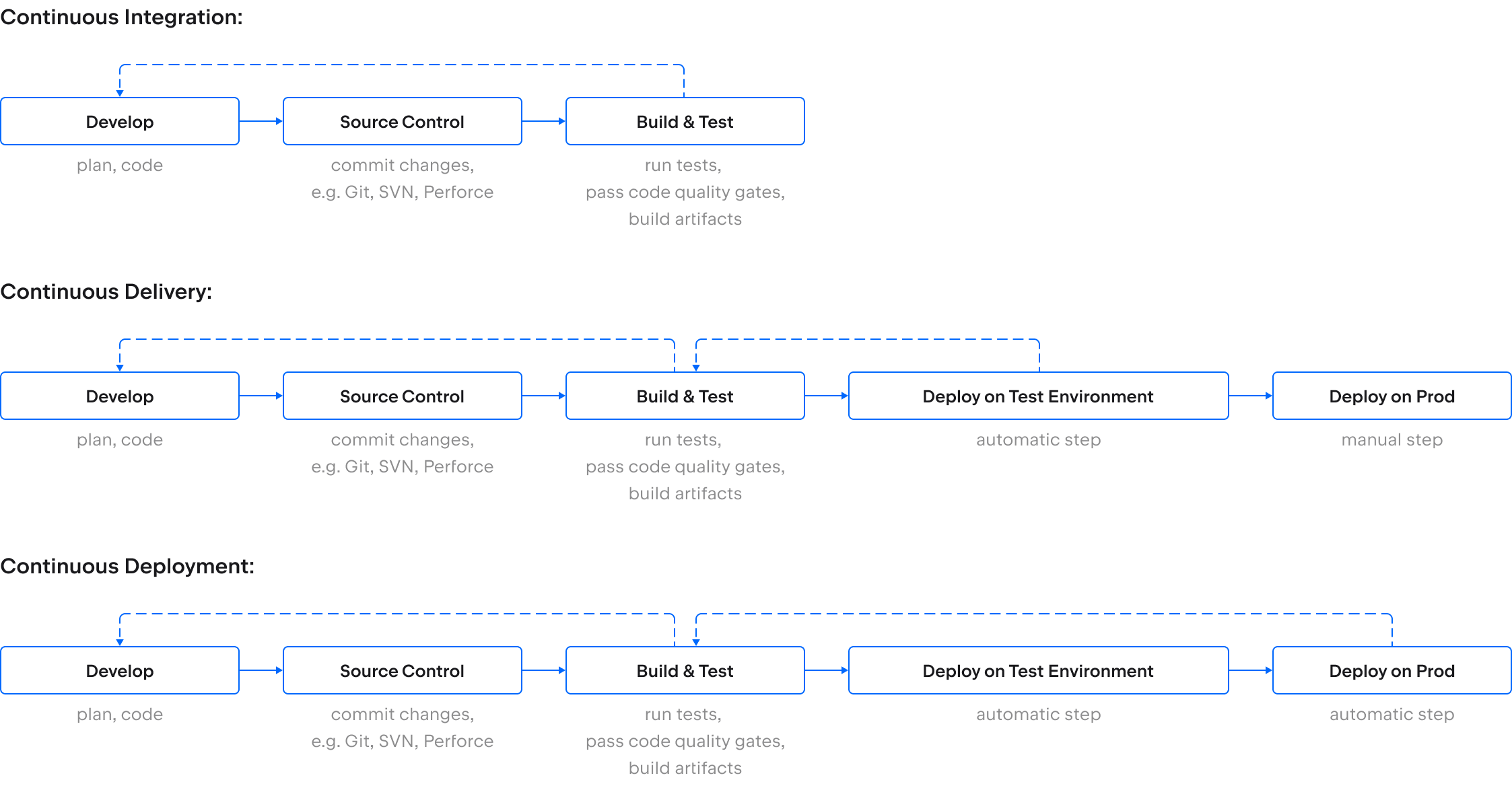 由于 CI/CD 的策略是高度规律地定期执行此流程(每天甚至每小时执行多次),因此应尽可能自动化。 如果一个步骤成功完成,就会自动触发下一个步骤。 如果某个步骤失败了,应迅速传达反馈信息,以便解决问题。