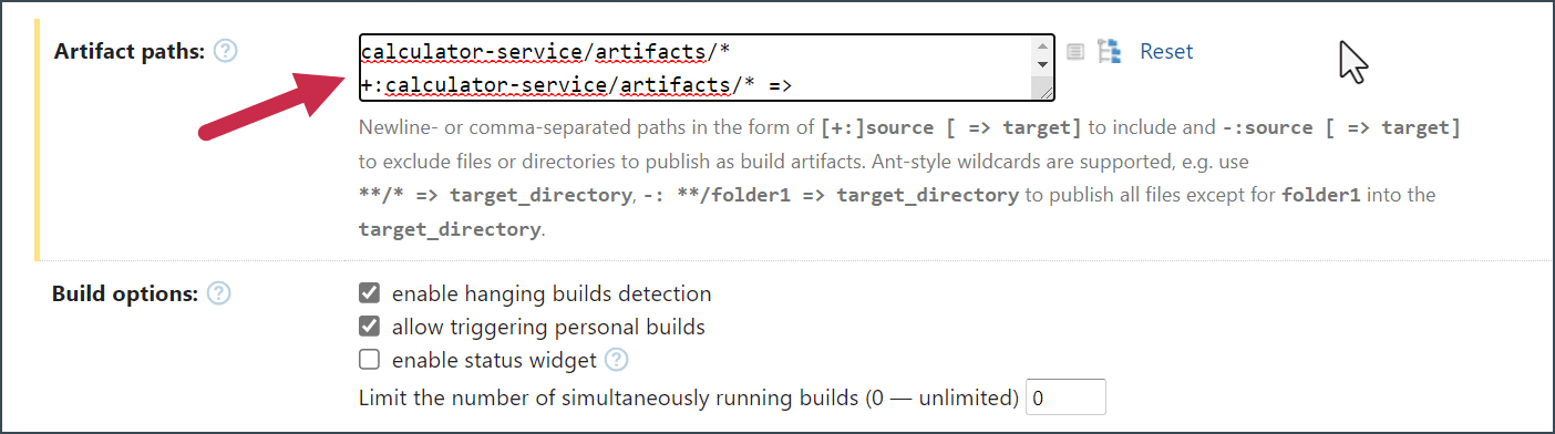 转到 Build Configuration settings | Artifact paths(构建配置设置 | 工件路径),可以看到两个工件都来自一个目录:calculator-service/artifacts/*。
