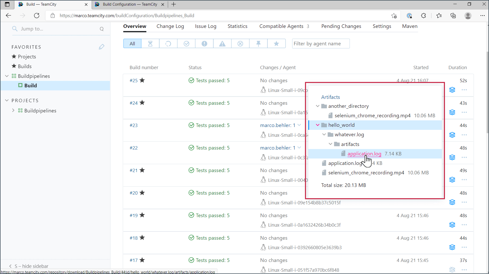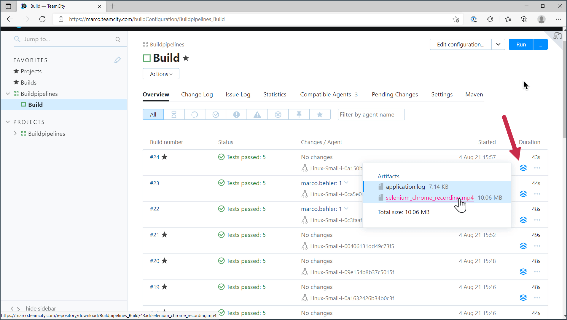 在这个构建中,将鼠标悬停在工件图标上时,可以看到有两个没有文件夹结构的工件:应用程序日志文件和 Selenium .mp4 录像。