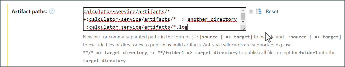 我们来指定一个不同的工件路径。 我们会告诉 TeamCity 将文件移动到 another_directory,而不是包含 artifacts 子文件夹中的所有内容。 我们还将排除每个 .log 文件,使其不会被复制到存储空间中。
