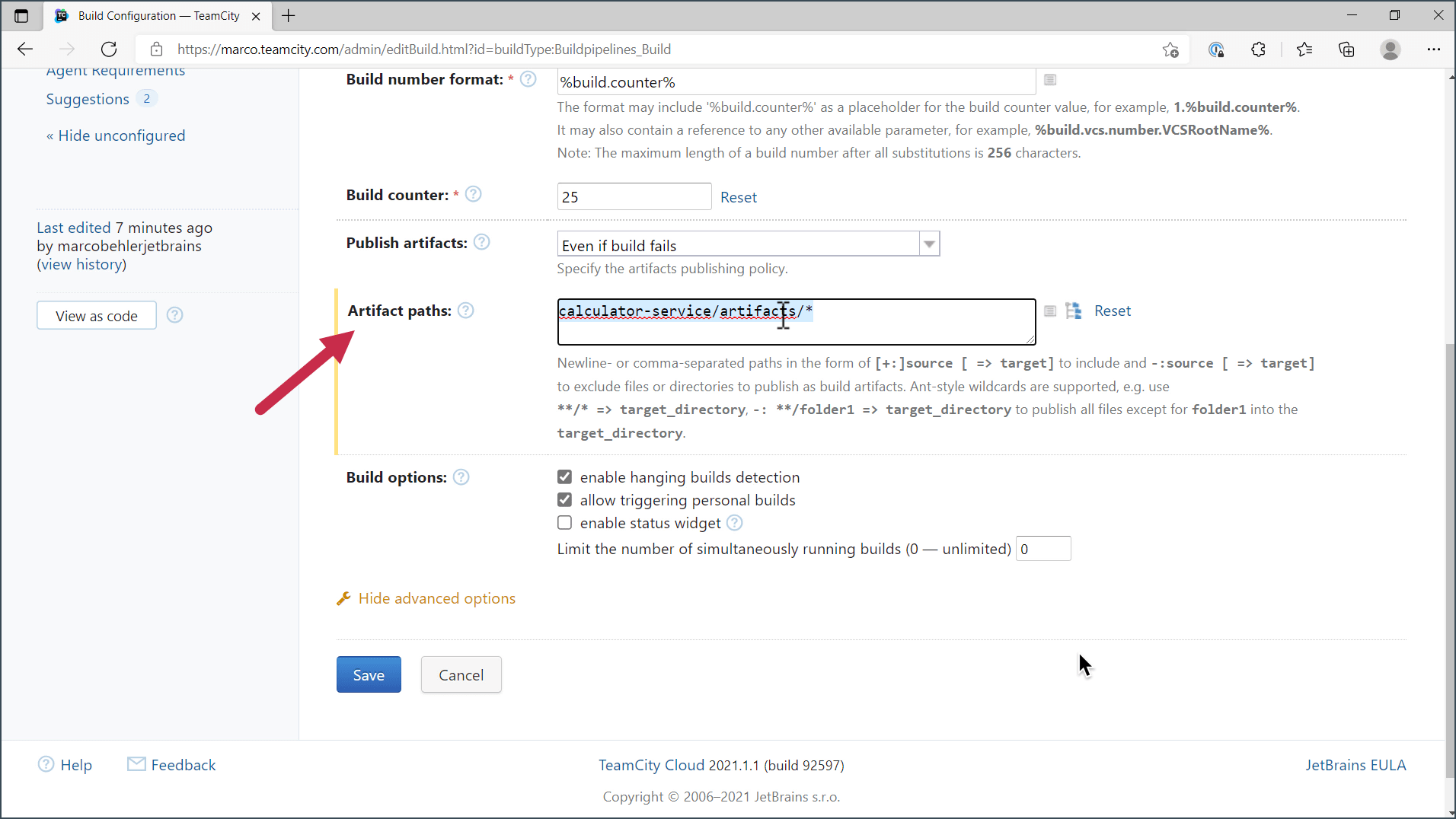 在示例中,我们告诉 TeamCity 将计算器目录中的所有内容包含在内,然后将其放入每个构建都有的工件文件夹中。 这个文件夹可能位于 Amazon S3 或其他存储空间服务中。
