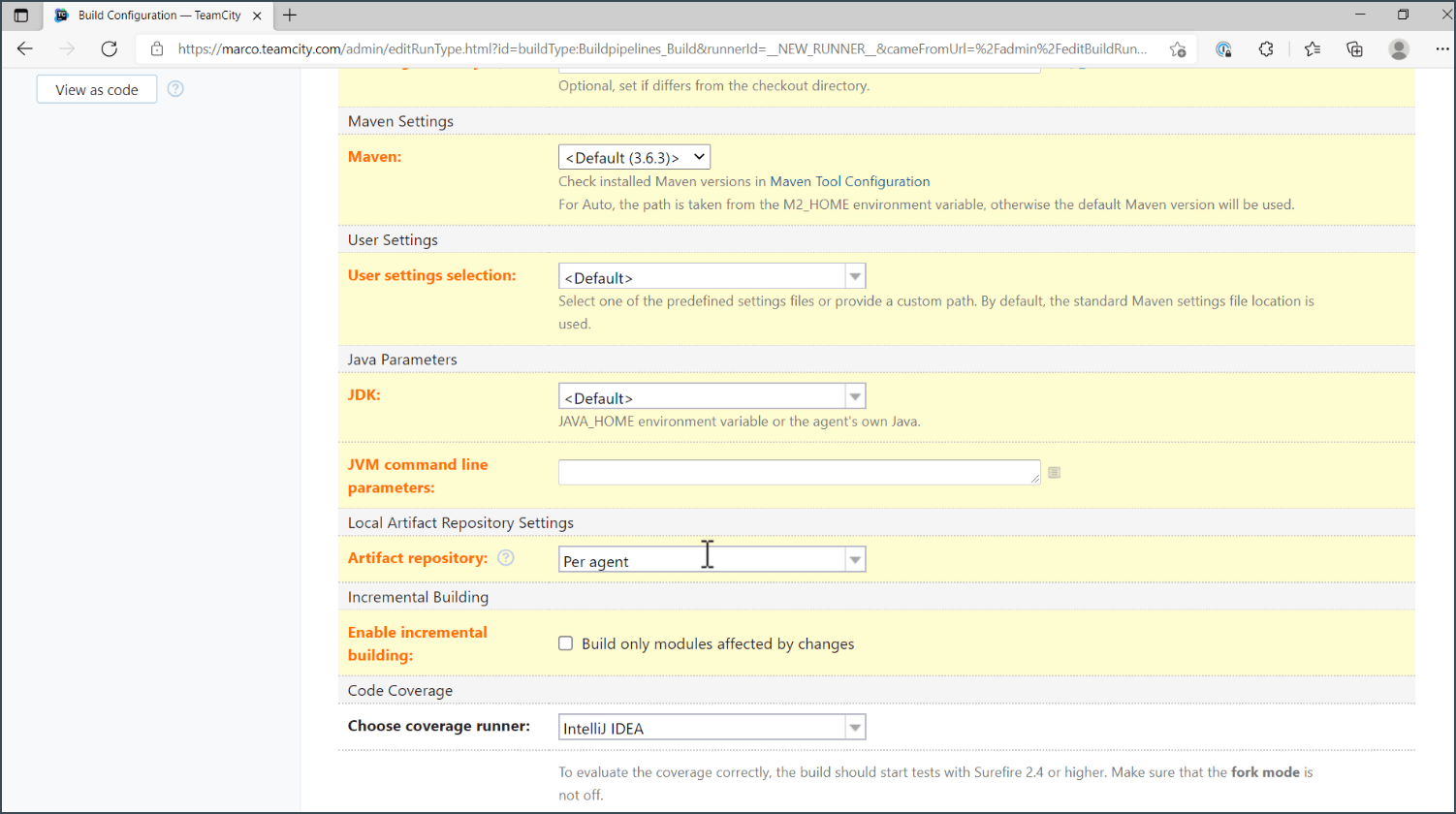 在 TeamCity 中,您可以选择特定的覆盖率运行程序。 例如,您可以添加 IntelliJ IDEA 或 JaCoCo 代码覆盖率运行程序,而不是在 pom.xml 文件中硬编码。
