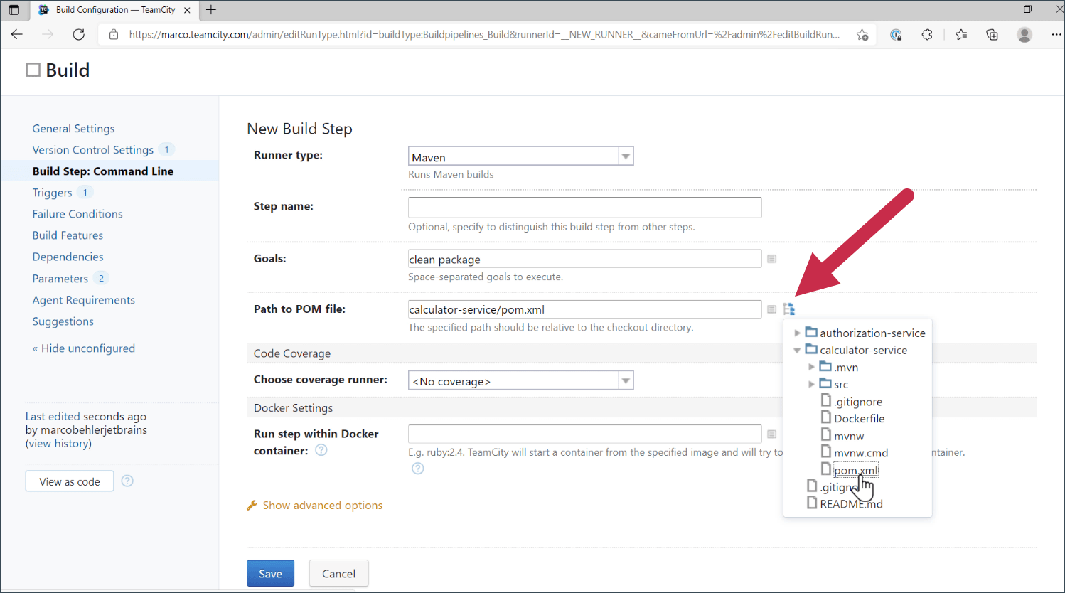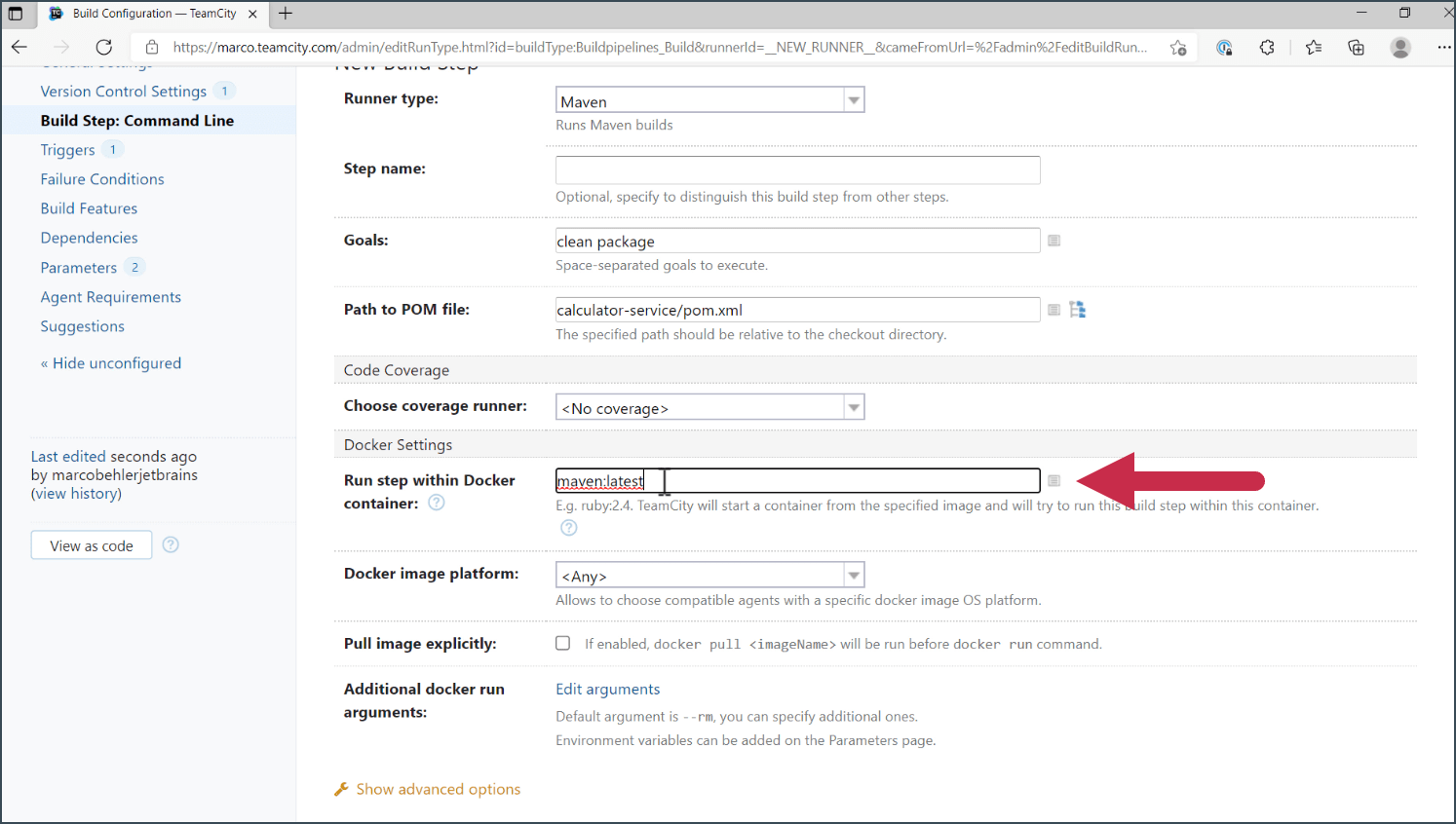 您可以提供来自 Docker hub 的 Docker 镜像名称(例如 maven:latest),在 Docker 容器内运行 mvn clean package 步骤。 TeamCity 将获取此镜像,透明地从中启动 Docker 容器,在其中运行 mvn clean package 目标,然后处置容器。