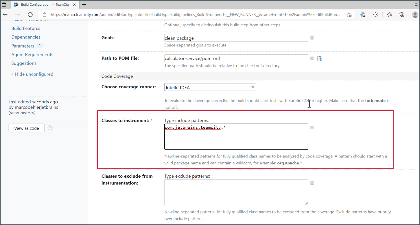 我们添加 com.jetbrains.teamcity.* 作为软件包模式名称。 然后,TeamCity 将分析名称与代码覆盖率模式匹配的软件包。