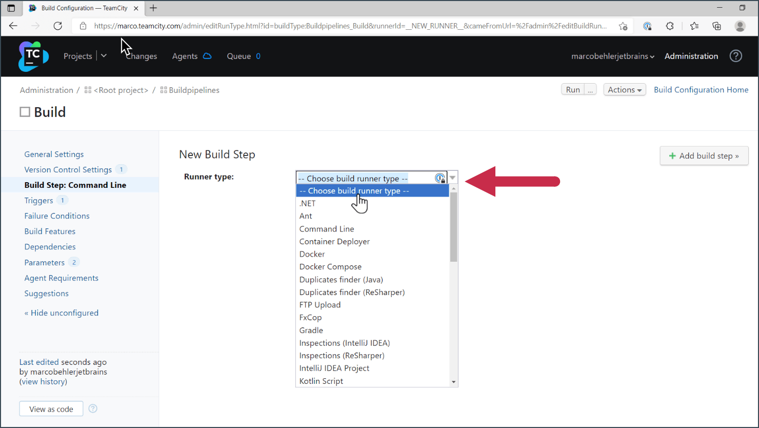 之后,我们将添加一个新的构建步骤。 TeamCity 将建议选择特定运行程序: