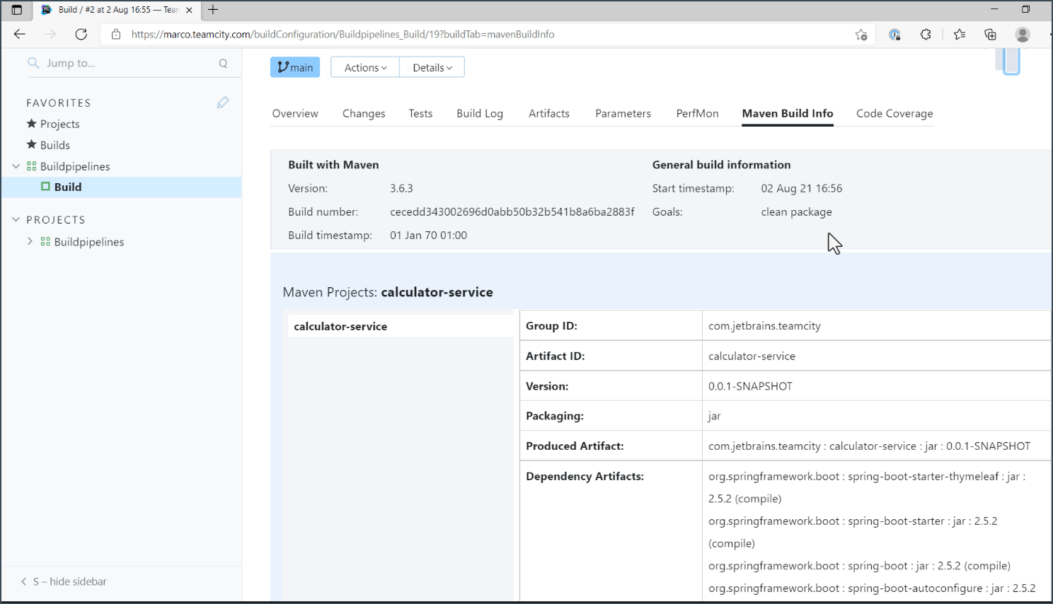 在 Maven build info(Maven 构建信息)页面上,您将获得使用特定 Maven 版本执行的目标的概览。 您还将看到生成的工件,例如 Maven 生成的 .jar 文件。