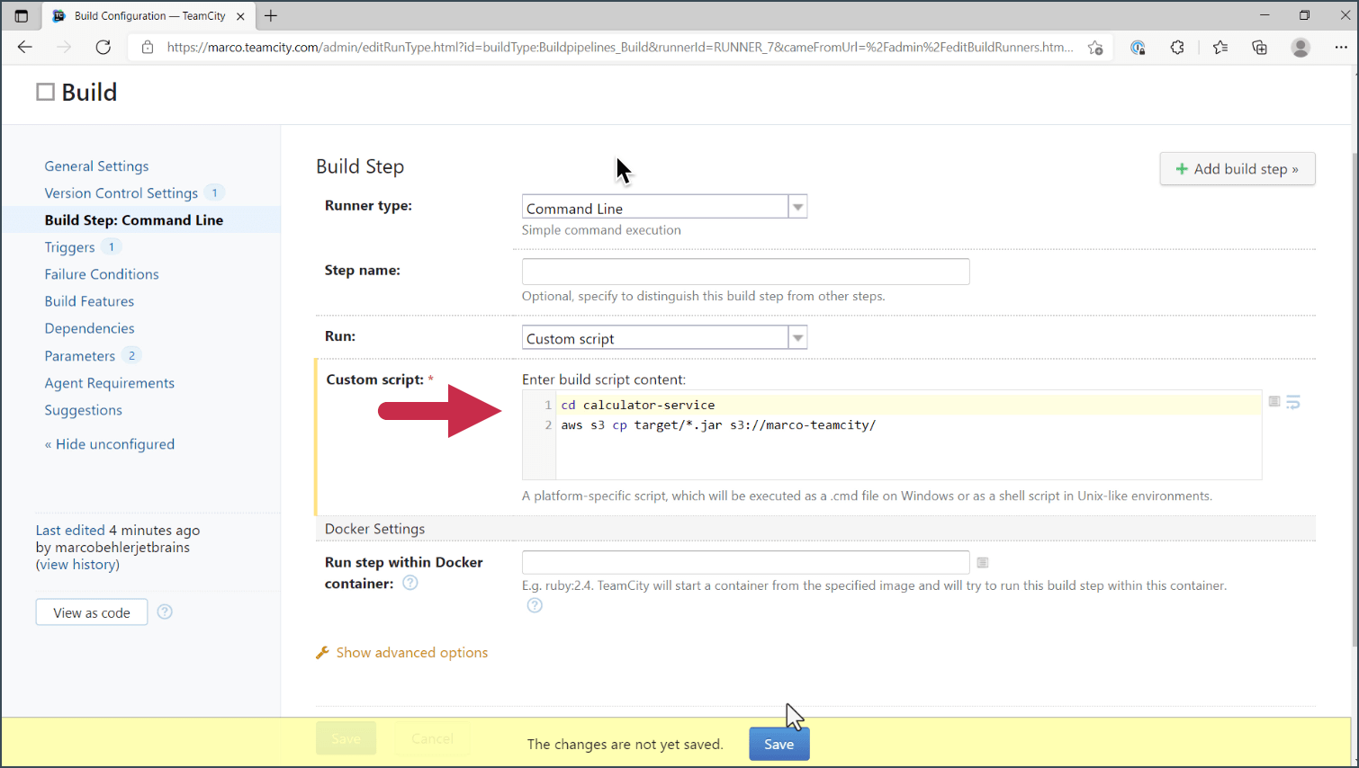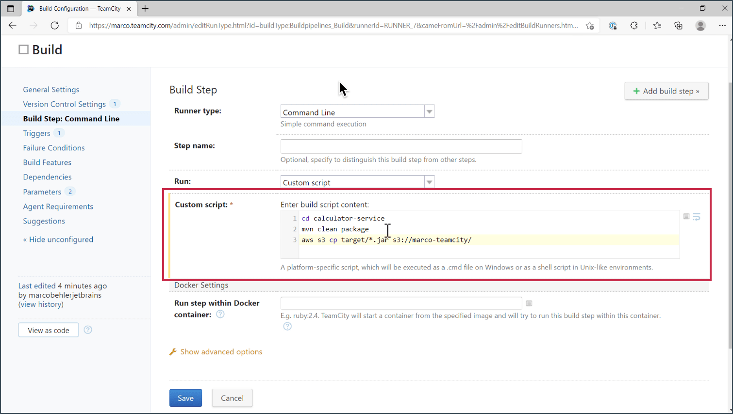 在这里,我们将摆脱 mvn clean package 步骤并使用 TeamCity 的特定 Maven 功能。 我们可以直接移除自定义脚本中的行并点击 Save(保存):