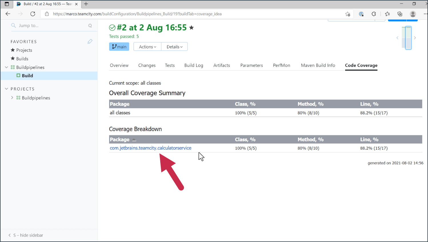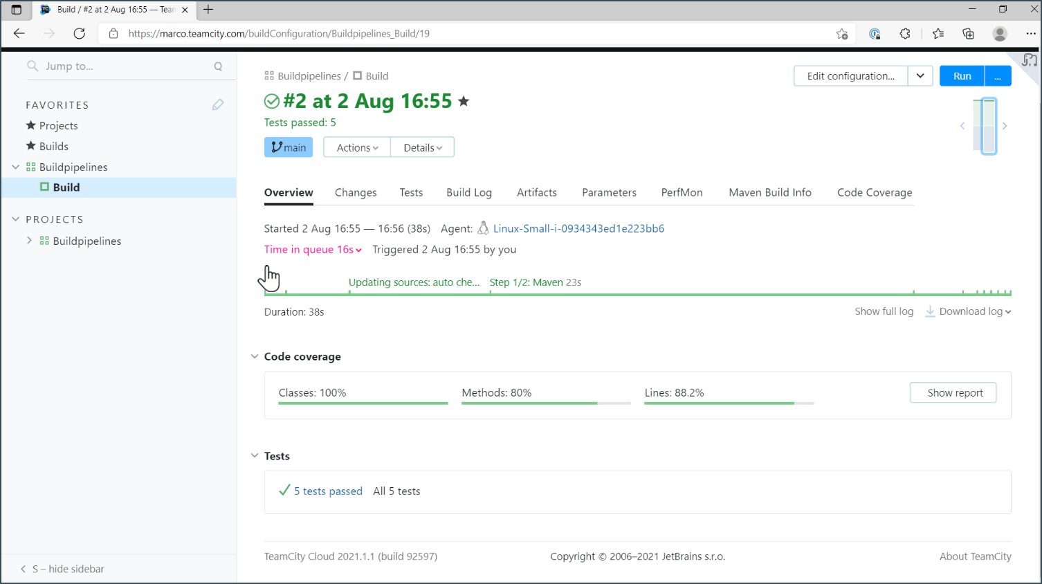在构建完成运行后,您可以访问构建概览页面。 这里有 Maven Build Info(Maven 构建信息)和 Code Coverage(代码覆盖率)等新标签页,以及 Tests(测试)和 Code Coverage(代码覆盖率)结果的新部分。