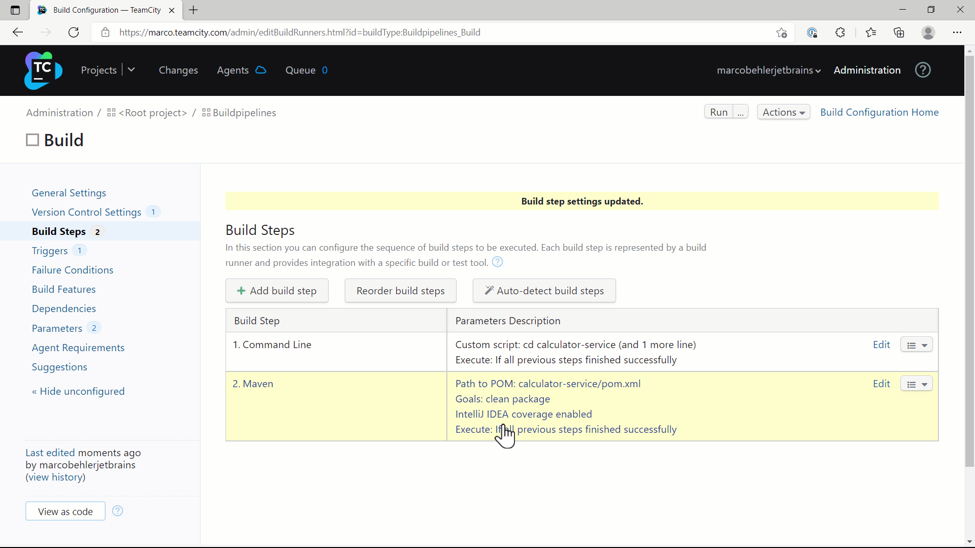 打开并编辑构建配置。 在这里,我们有一个构建步骤 – 命令行构建步骤。 脚本处理以下命令: