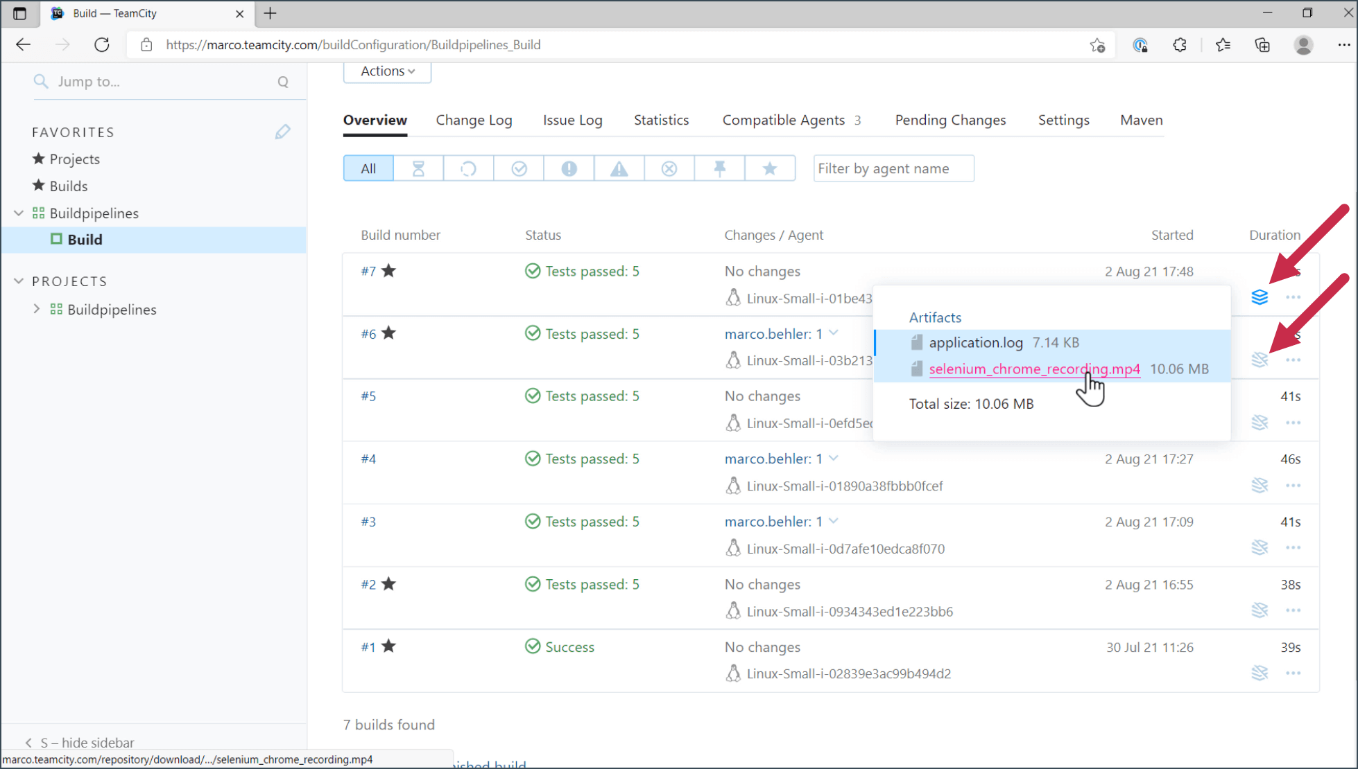 浅蓝色图标表示 TeamCity 已成功发现并存储此构建的工件。 点击蓝色图标时,我们可以看到有两个文件存储为工件 – 应用程序日志和 Selenium 录像。