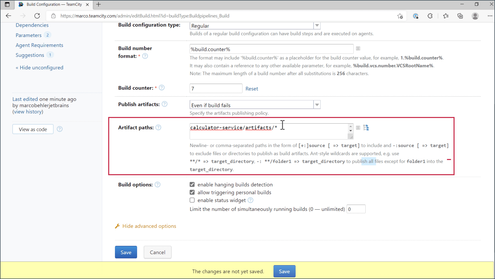 在本例中,我们知道构建创建了一个工件子目录,并且我们想让该子目录中的每个文件都可用。 在字段中指定工件路径,然后点击 Save(保存)。