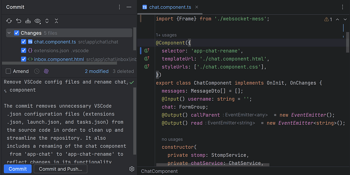 AI Assistant 可以用自然语言总结和解释提交中的差异内容,并生成描述您的更改的提交消息。