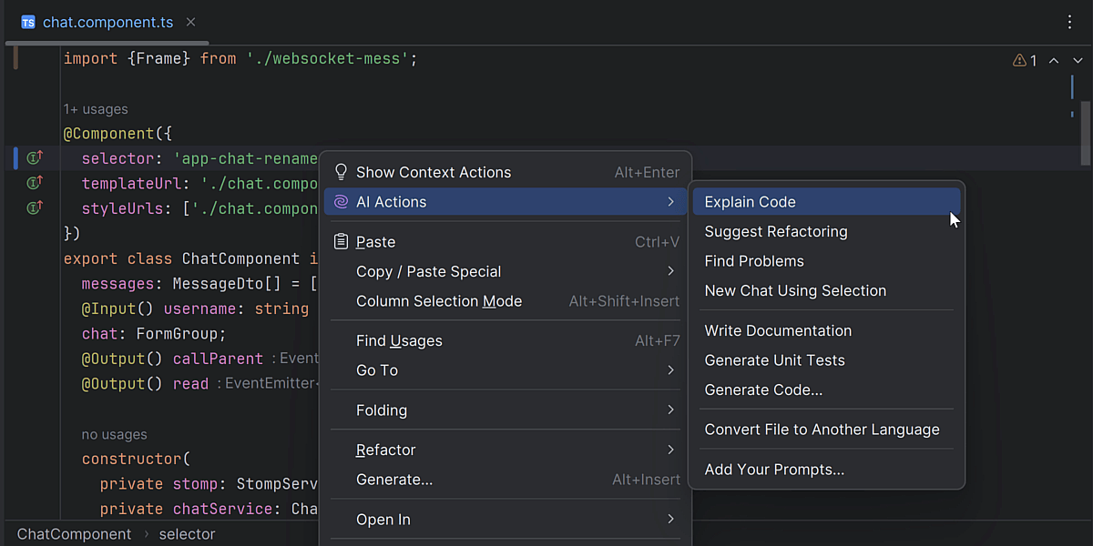 向 AI 询问有关项目的问题或迭代任务,无需离开 IDE 或复制粘贴代码段。