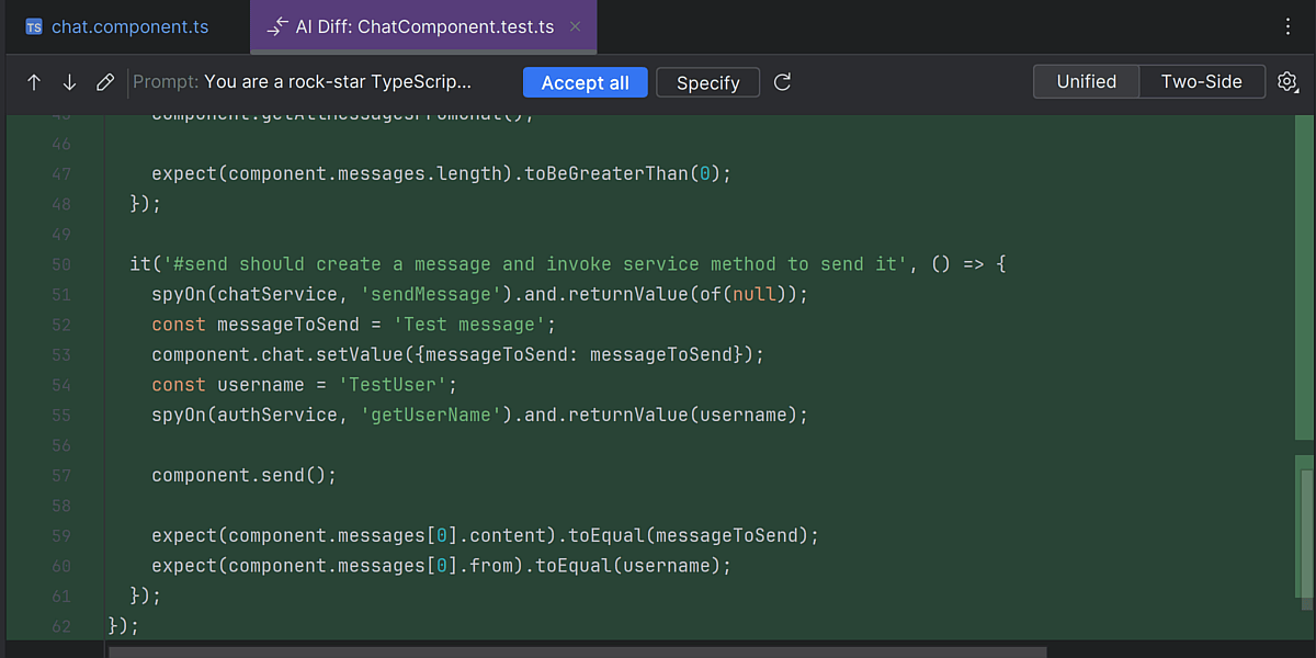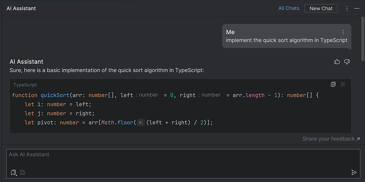 AI Assistant 会分析您的代码和文档,为您的代码生成测试。 它还可以编写声明文档。