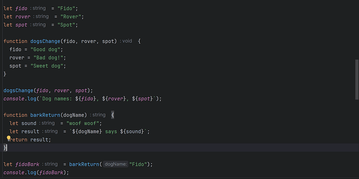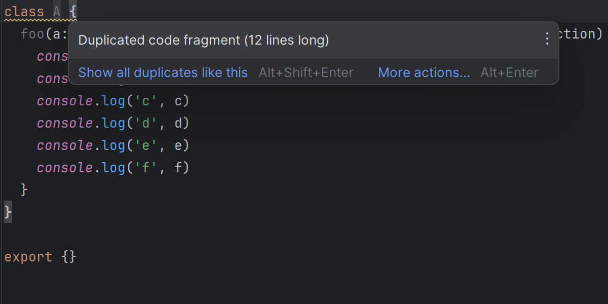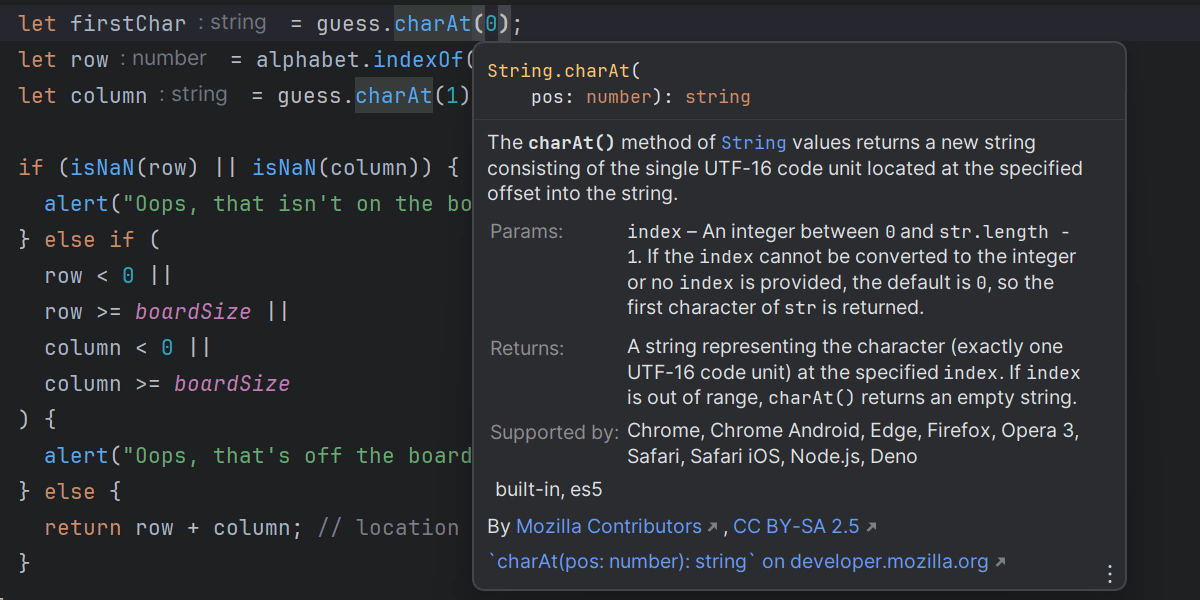 想要查找符号的文档? 无需离开您的 IDE! 只需将鼠标悬停在该符号上或将文本光标放置在该符号上,然后按 Ctrl+Q 即可查看所有相关信息。 此外,WebStorm 可以在方法和函数调用中显示形参提示。